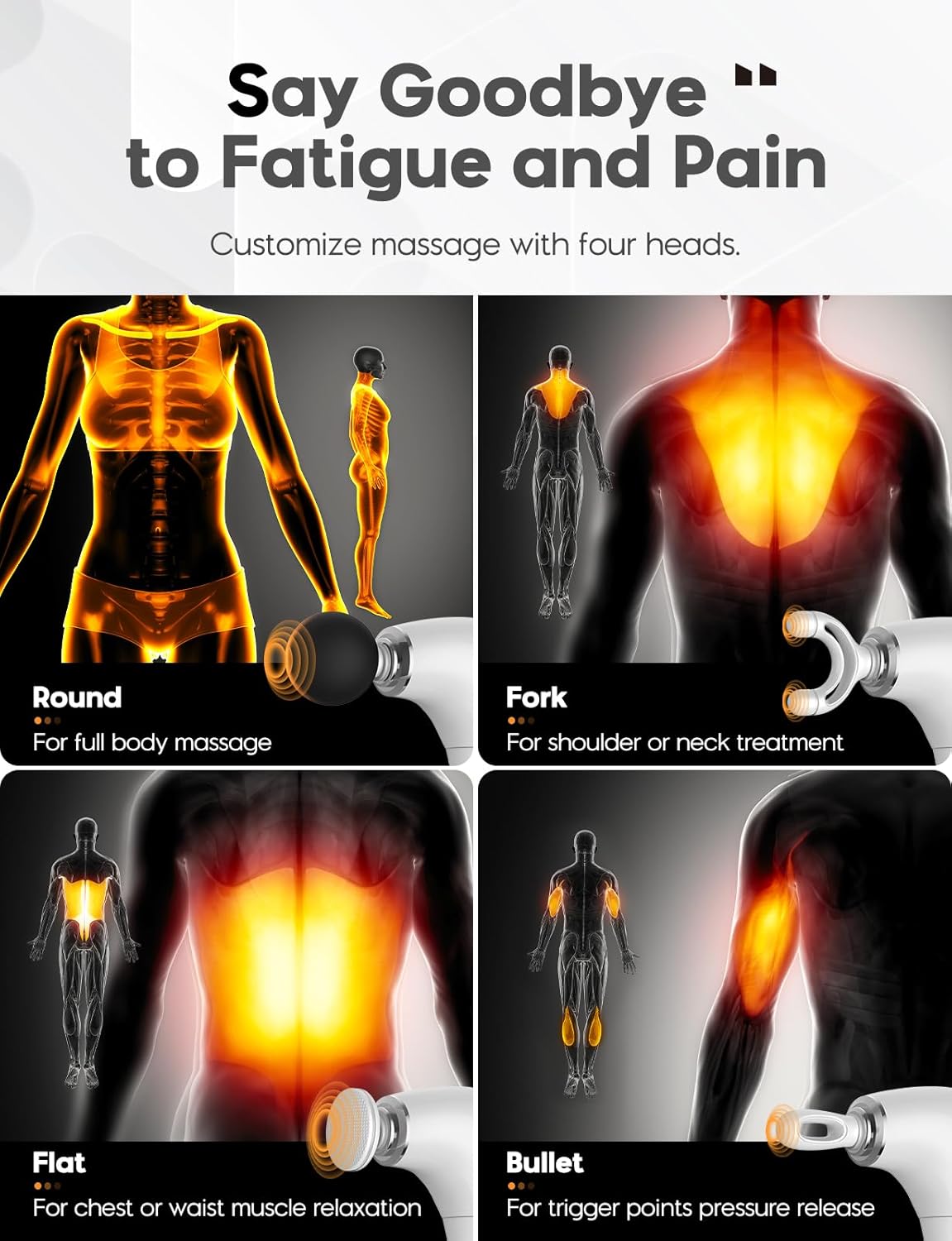 - 4 Interchangeable Heads and 5 Speed Levels. Customise your massage gun with 5 speeds 1000-2600RPM. Interchange the Deep Tissue Massage Gun's 4 unique massage heads to target different body parts, muscles and other areas of tension for effective relief from fatigue and pain