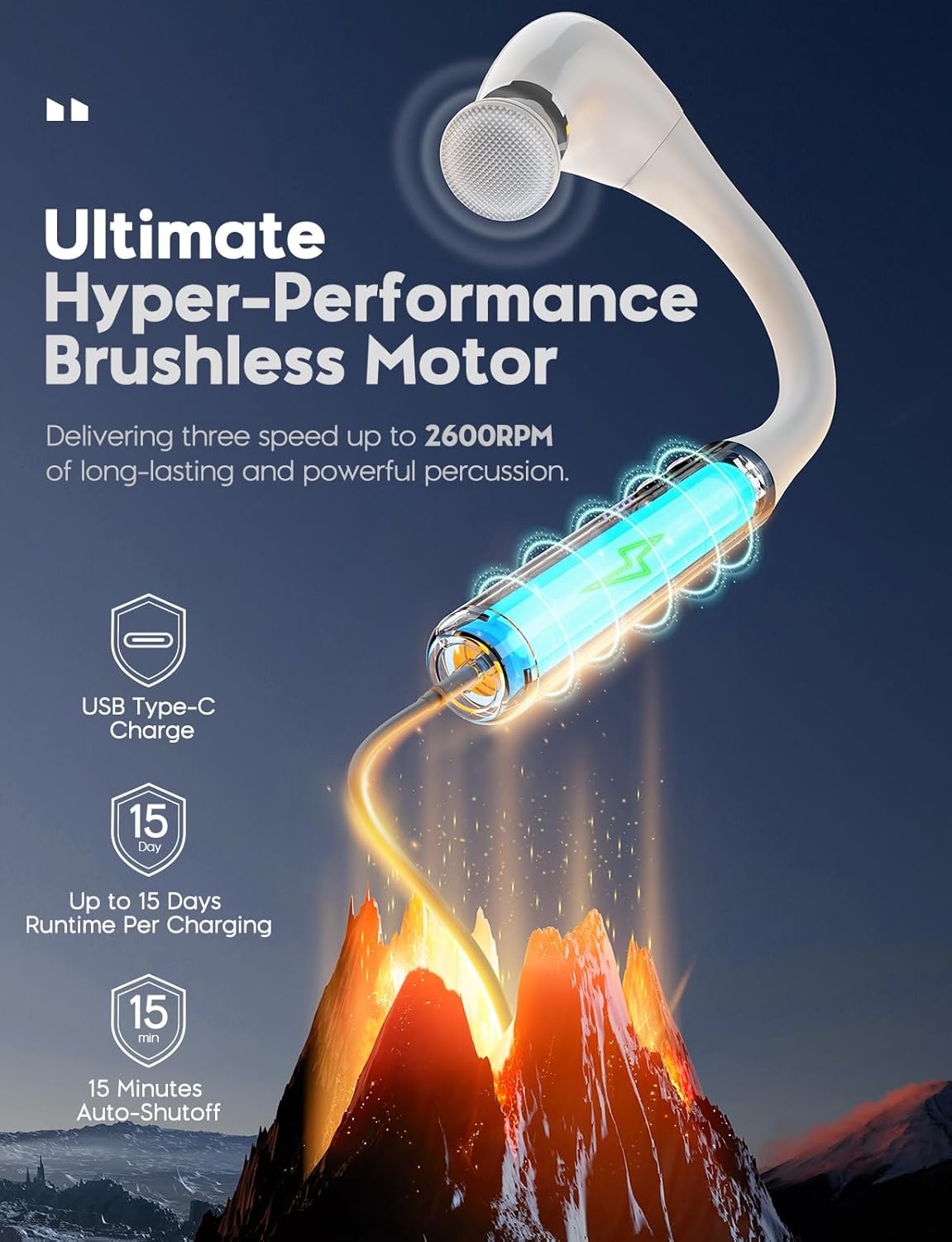 - Long Serve Time. The back massager can be quickly recharged in 90 minutes via USB Type-C cable or mobile power. Enjoy 15 minutes of unparalleled massage at a time for up to 15 days with our handheld massage guns