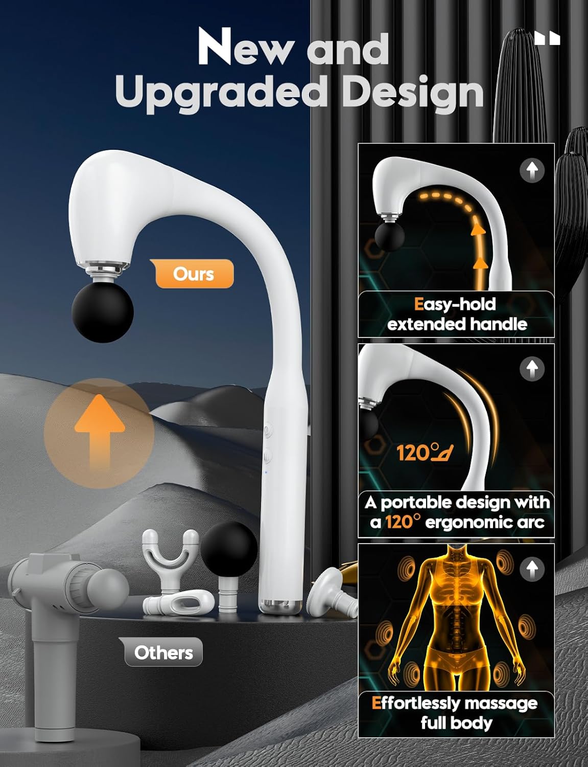 - Comfortable Handle Extension and Ergonomic Design. The massage hammer features an easy-to-grip extended handle and an ergonomic 120° curved design that seamlessly conforms to the physiological curvature of the human spine. Unlike ordinary massage guns, our Deep Tissue Massage Gun with flexible arms makes it easy to relax your back/neck/shoulders/waist/legs/arms and other hard-to-reach areas without help. It is a massage tool for pain relief and accelerated recovery from sports injuries