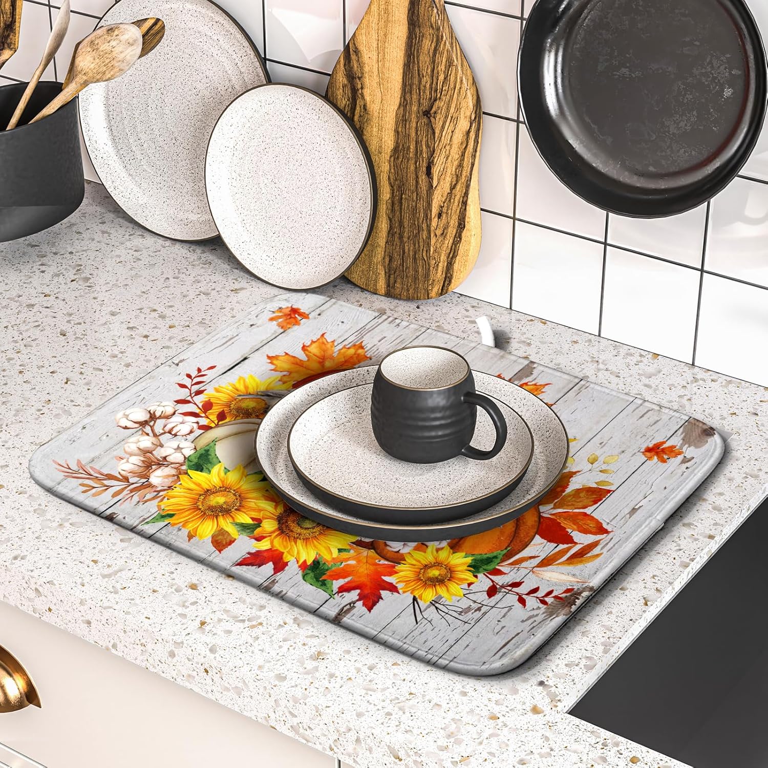 - 【Easy to Storage】This harvest pumpkin design drying mat with hang rope, soft and foldable, durable, easy to storage it by hanging or folding it up in a drawer or tuck it elsewhere. Perfect for tight spaces like campers, boats and cottages where having a dual purpose item will come in handy.
