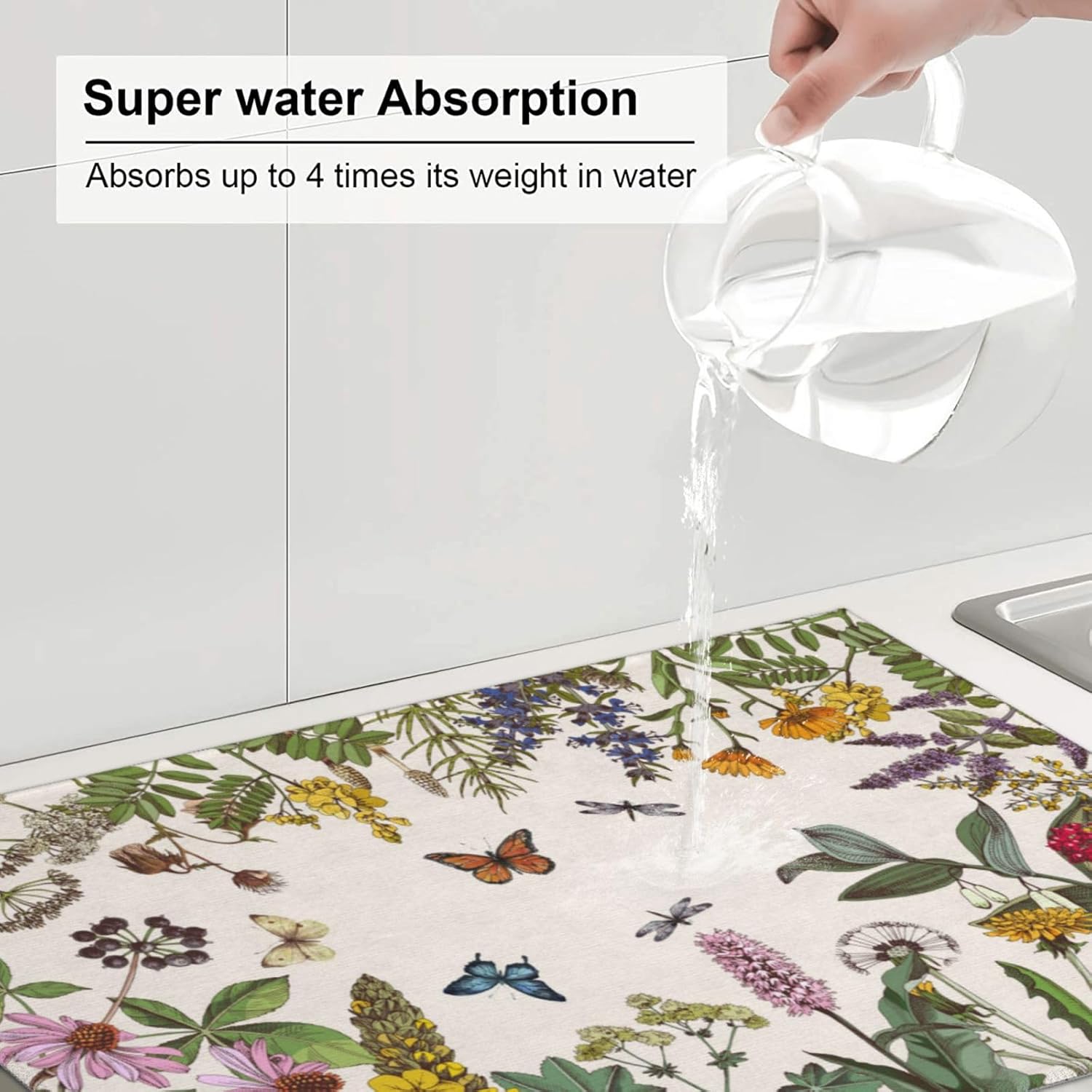 Wild Flower Herbs Dish Drying Mat For Kitchen Counter Absorbent Large Kitchen Fast Dry Pad Reusable Washable Protector Rack Large Mat 18 X 24