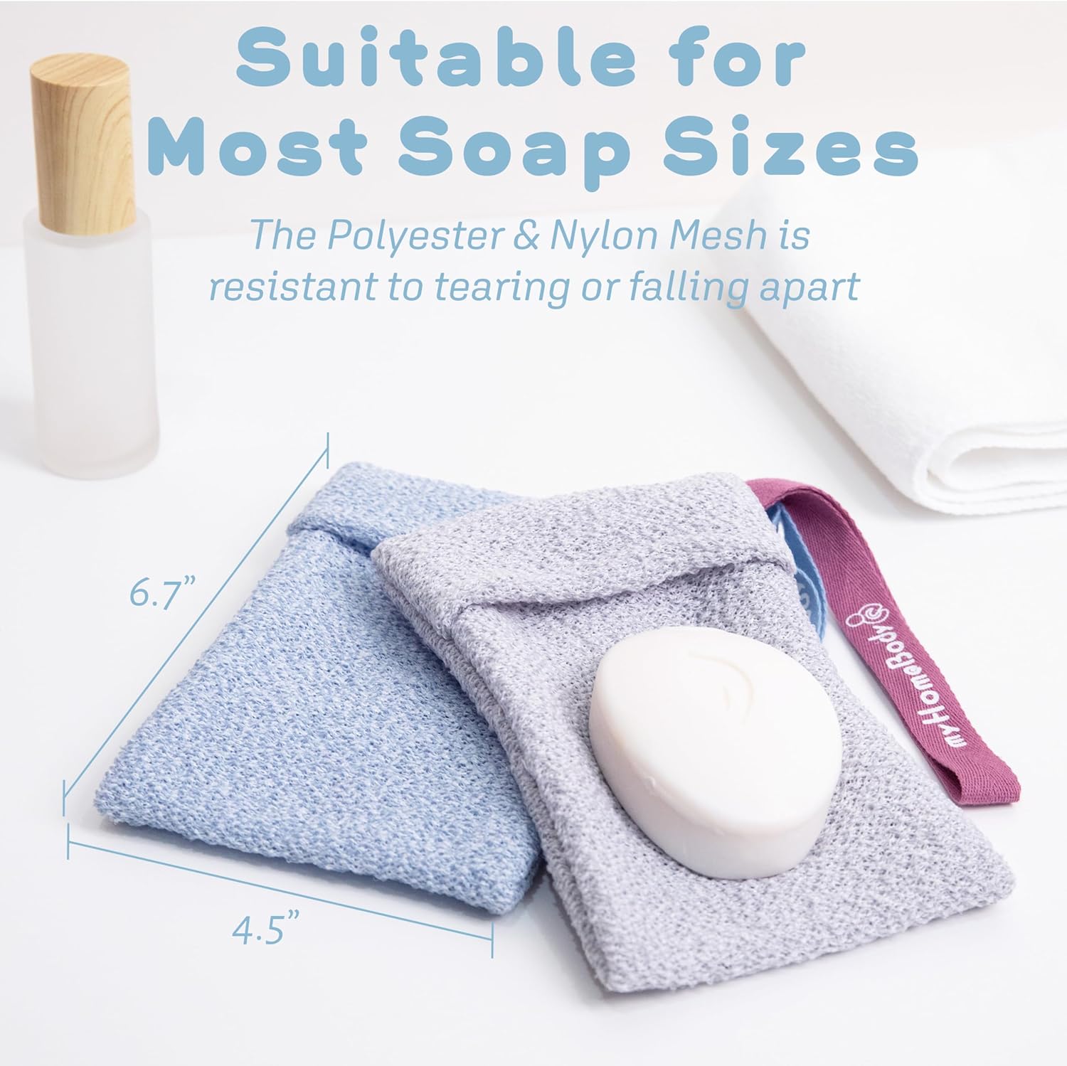 myHomeBody Soap Pocket for Gentle Exfoliating, Lather Mesh Bag, Body Scrubber Exfoliator, Pouch for Shower, Leftover Bits Saver, Light Blue, Gray - 2 Pack