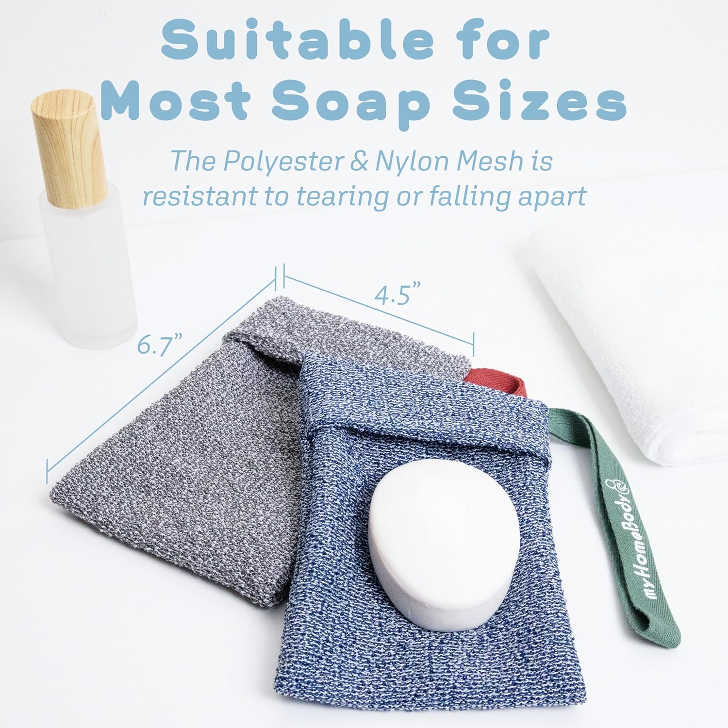 myHomeBody Soap Pocket for Strong Exfoliating, Lather Mesh Bag, Body Scrubber Exfoliator, Pouch for Shower, Leftover Bits Saver, Dark Blue, Gray - 2 Pack