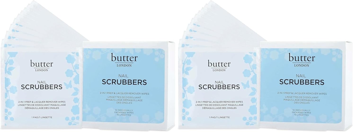 - Nail Scrubbers: Say goodbye to yesterday’s stubborn nail lacquer and glitter in one easy step with the new and improved dual-sided butter LONDON Nail Scrubbers. Intensely saturated and easy-to-use, includes 10 individually wrapper pads.