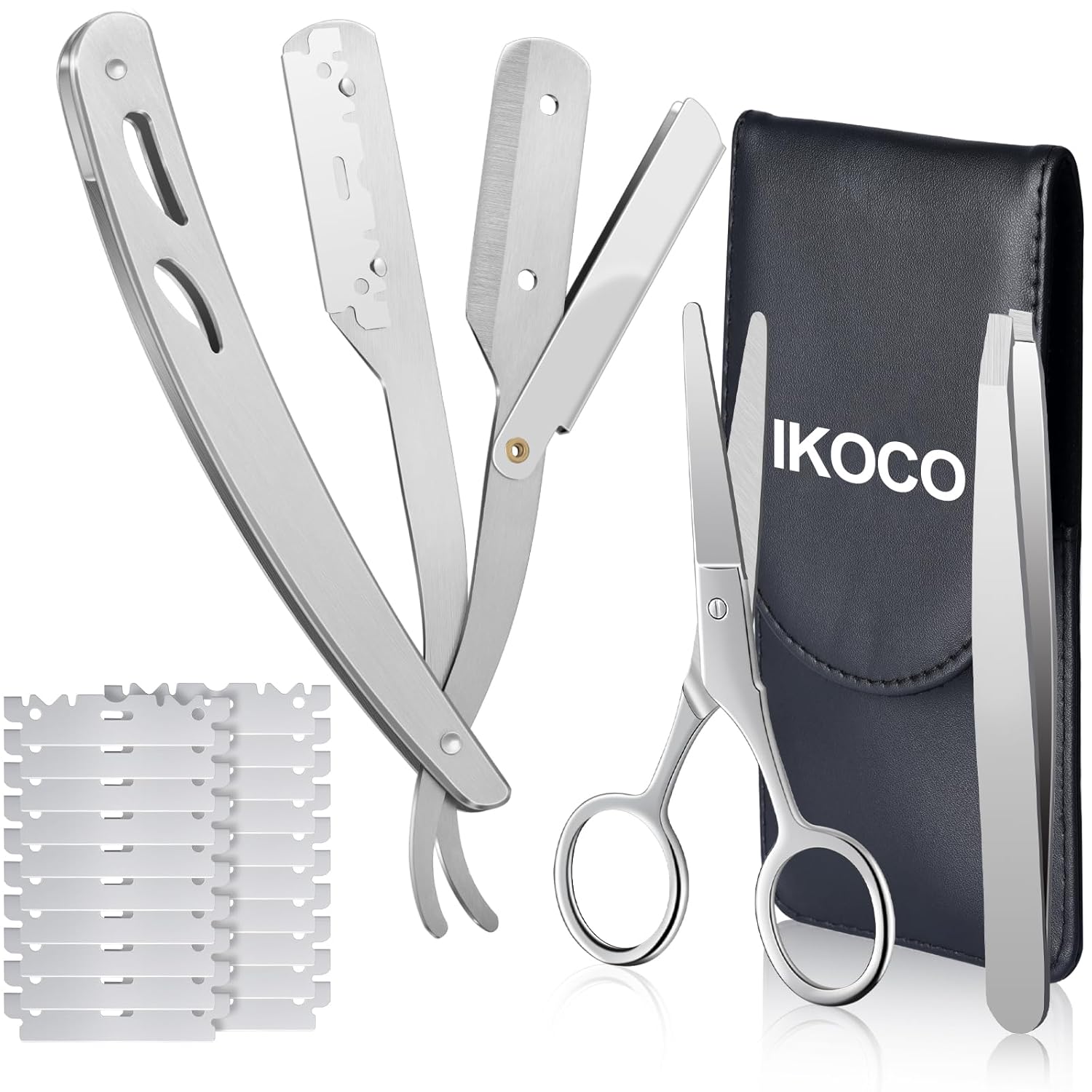 Straight Razor for Men, IKOCO Black Straight Edge Razor Kit with 20PCS Barber Shaving Blades, Leather Case, Scissor, Tweezer, Silver