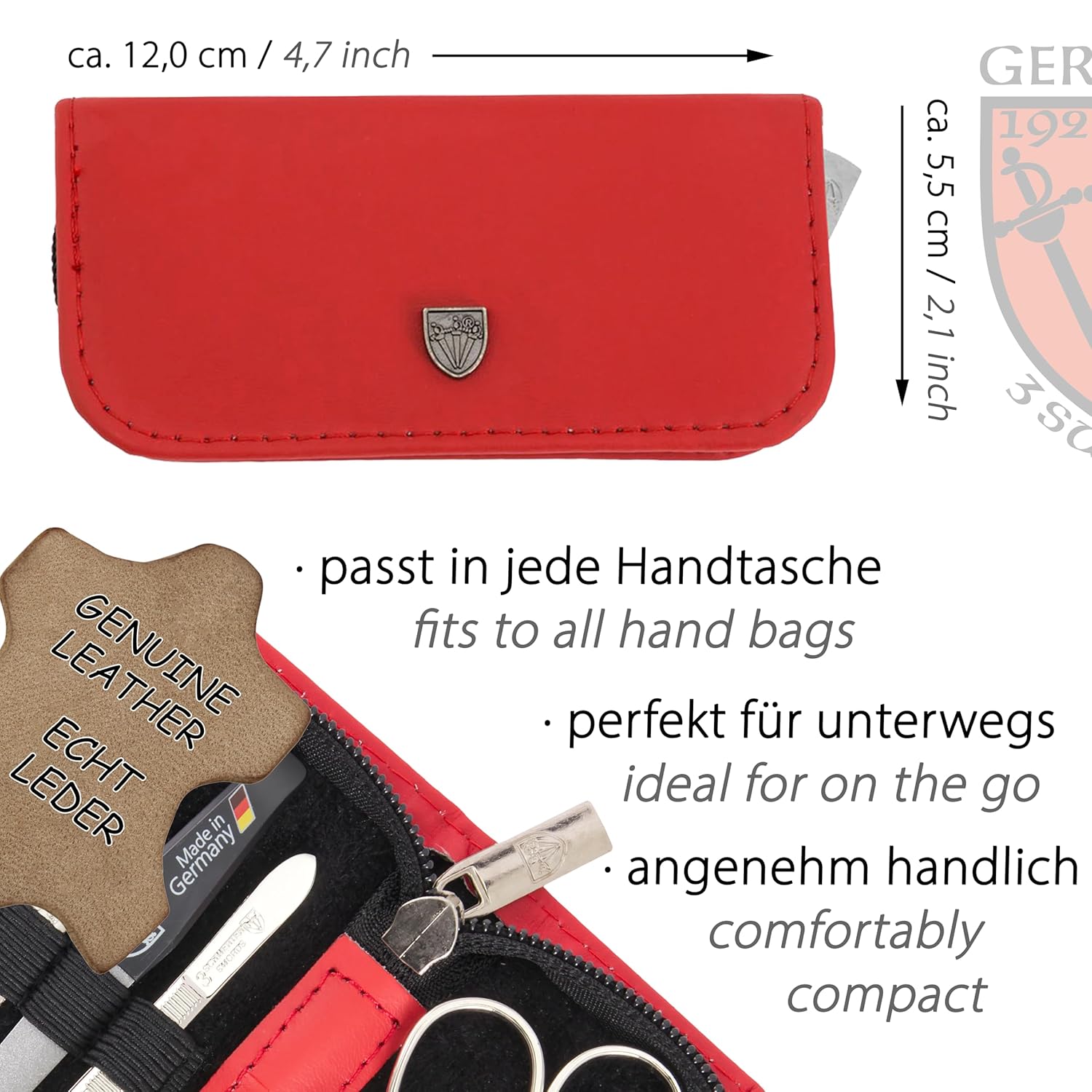 - CASE: Genuine leather red, size ca. 12,0 x 6,0 x 3,0 cm. Our organizers are made of high-grade fashion or classic materials. Additional equipment: Microfiber cleaning cloth for cleaning steel items, general info sheet “Finger - Nail Grooming”.