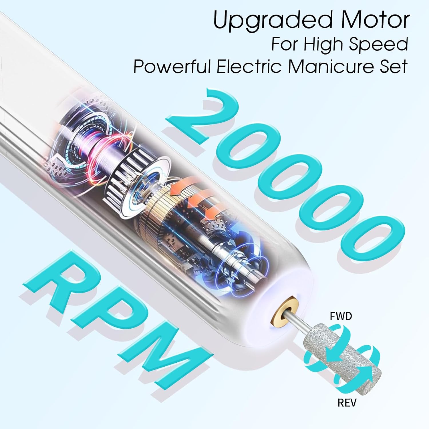 - Easy to use, Even for Beginner: This electric manicure pedicure kit have 3 adjustable speed 0-20,000rpm and designed with forward and reverse rotation directions,choose the appropriate speed and rotation for your needs; ergonomic body design for comfortable holding, speed and direction controlling. Easy to use, enjoy a salon-quality professional manicure pedicure at home. EVEN BEGINNERS CAN USE THIS ELECTRIC NAIL FILE WITH EASE !