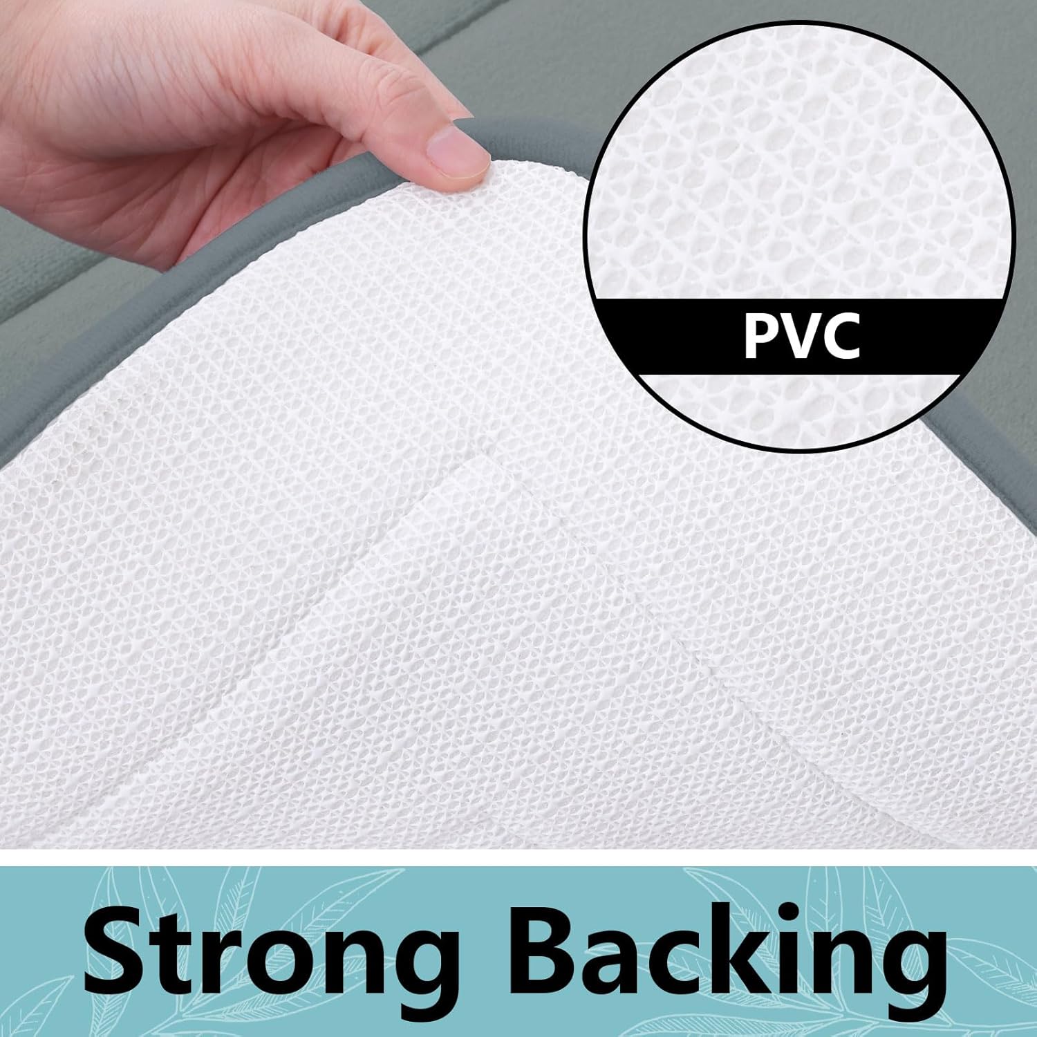 - PVC Backing : Our bath mat features a non-slip backing made from good quality mesh PVC that helps ensure you and your family stay secure. WARNING: Place mat on CLEAN DRY SMOOTH FLOOR only. Water under bath mats can cause it to slip. Keep bottom of mat dry. Before using bath carpet, test with foot to ensure it doesn't move