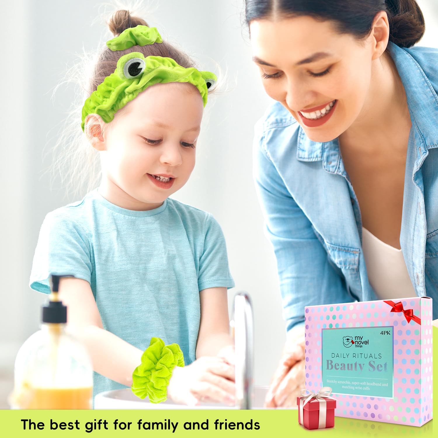 Face Wash Headband, Skincare Headband Wrist Bands For Washing Face Set Spa Hair Bands come with a Hair Scrunchie Cute Green Frog Elastic for Makeup Girls Women