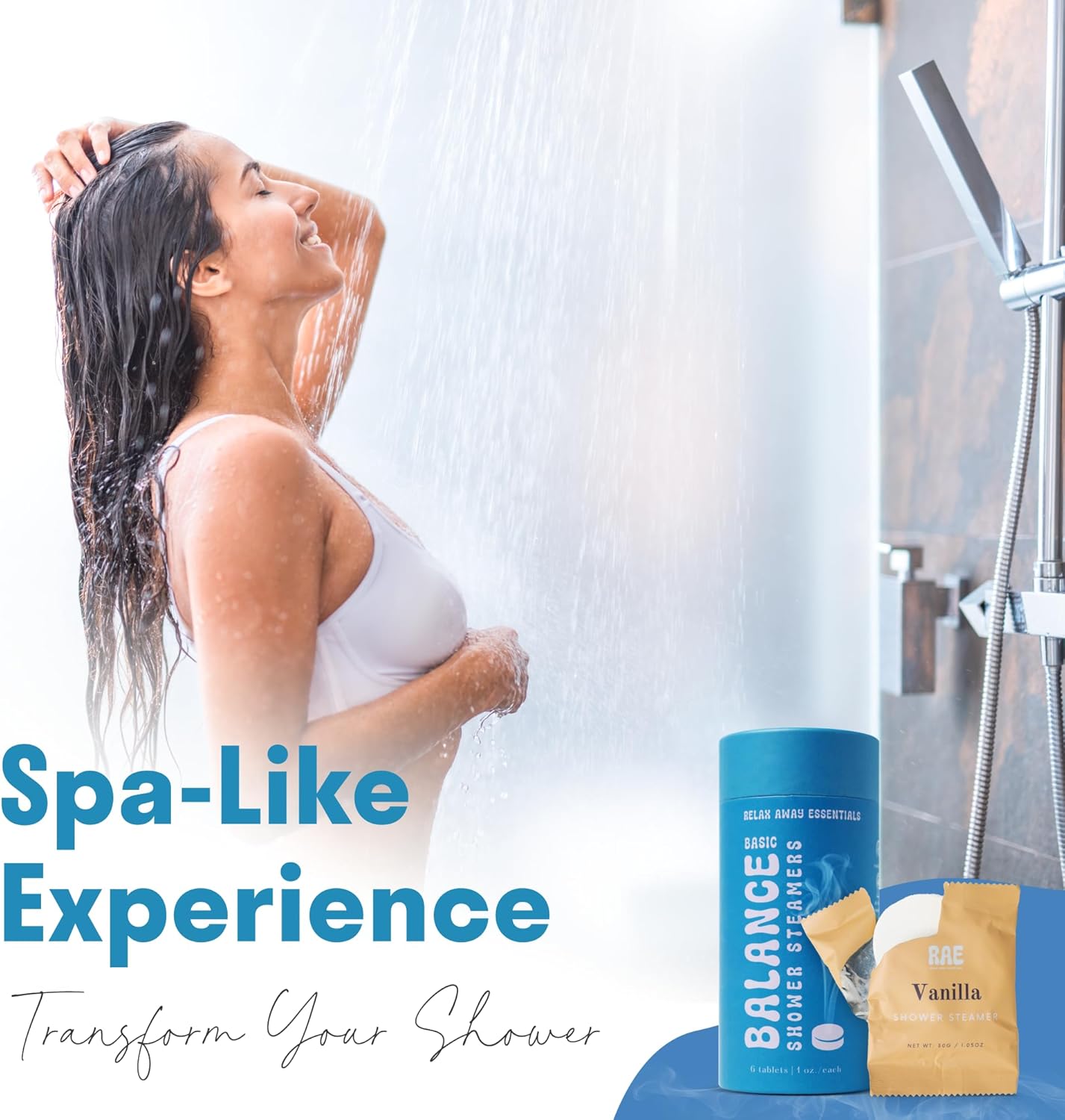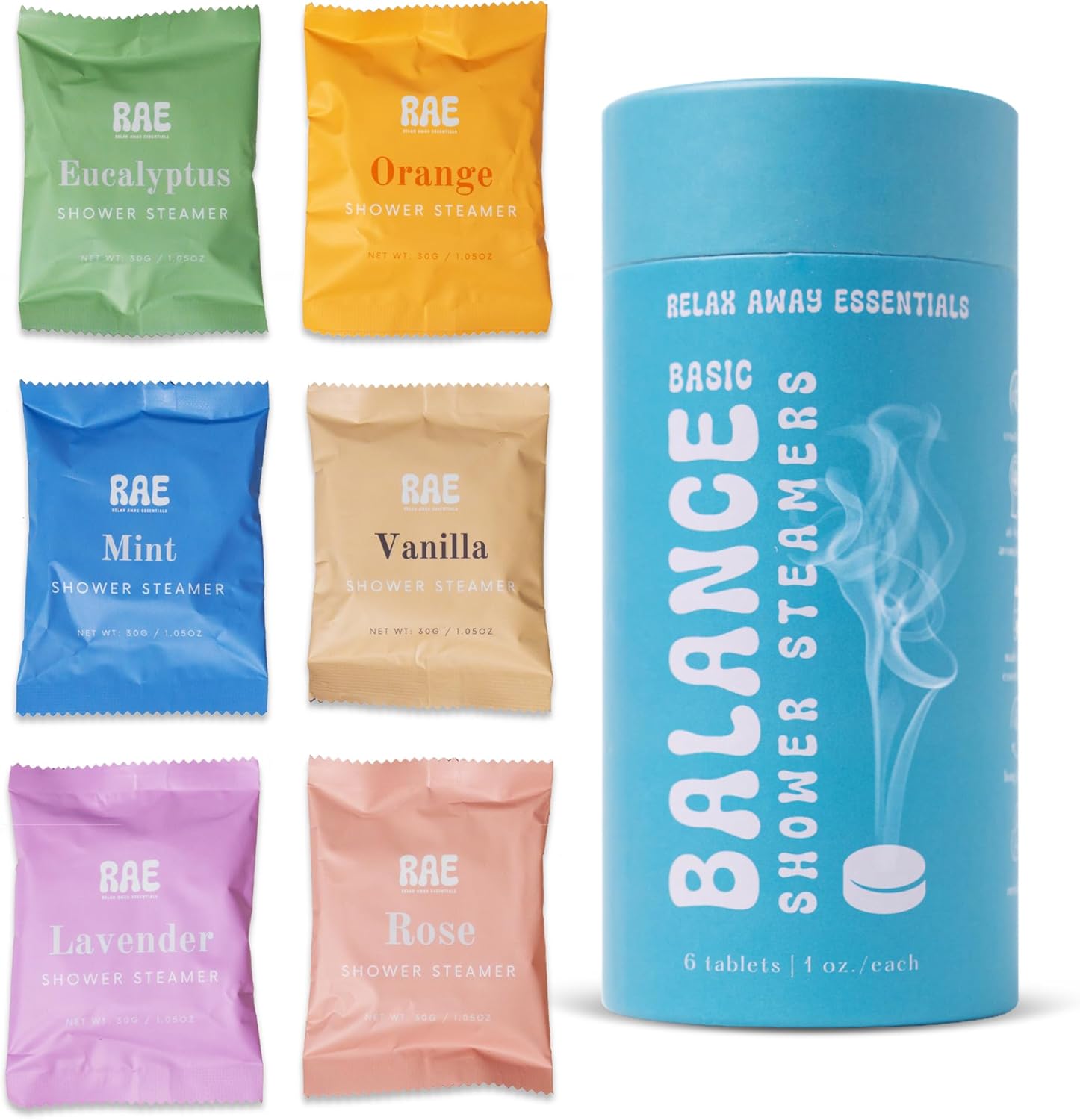 - Balance Shower Steamers 6 Pack: Six uniquely balancing scents including Orange for upliftment, Vanilla to soothe, Rose for a pleasant mood, Eucalyptus for clarity, Lavender for relaxation, and Mint for relief.