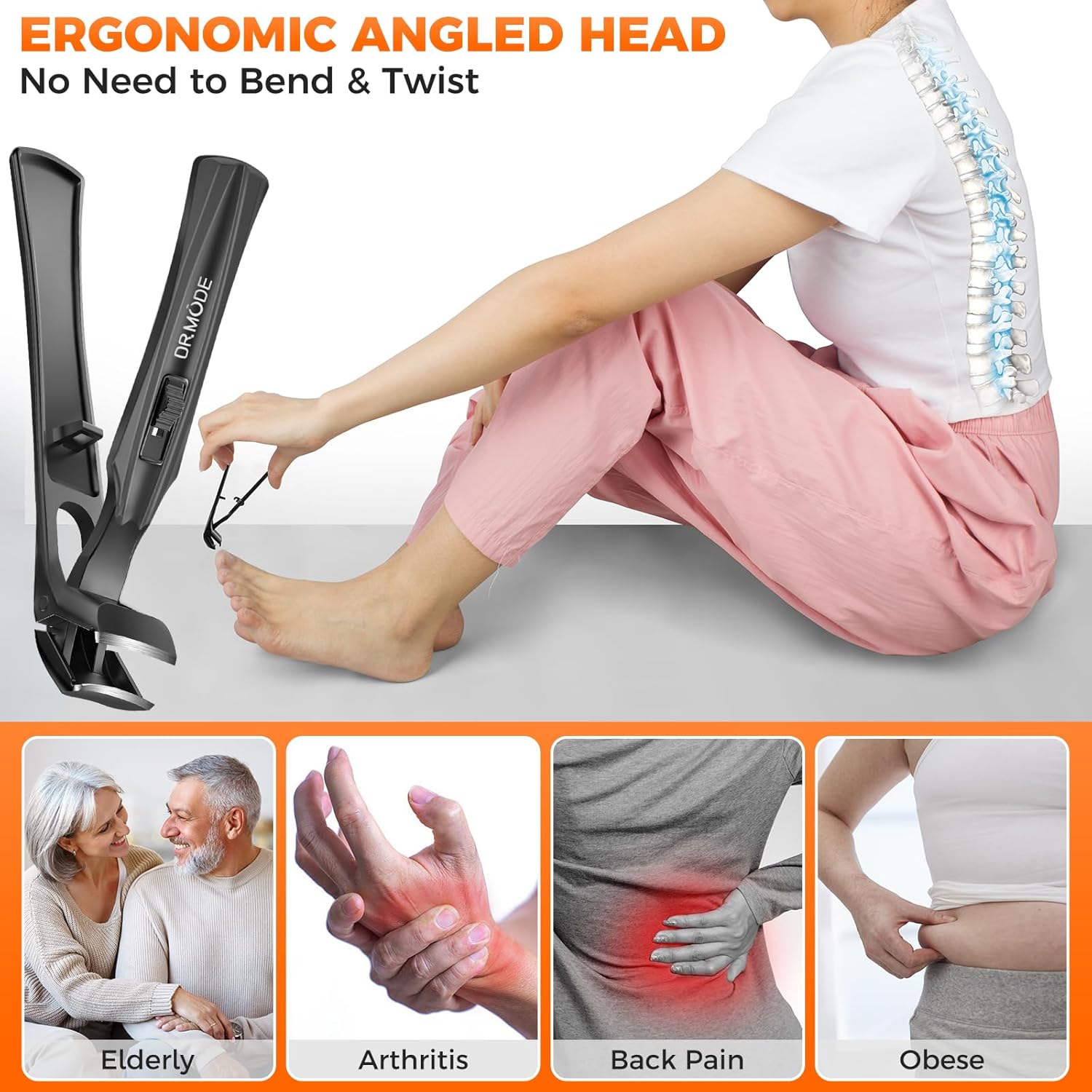 - NO NEED TO BEND & MORE COMFORTABLE - New angled head nail clippers are ergonomically designed, providing a clearer view of the blade and nail for accurate and confident nail cutting. With this nail cutter, there is no more awkward twisted posture in order to cut your toenails. Nail clippers with catcher is suitable for the elderly, pregnant women or men, etc.