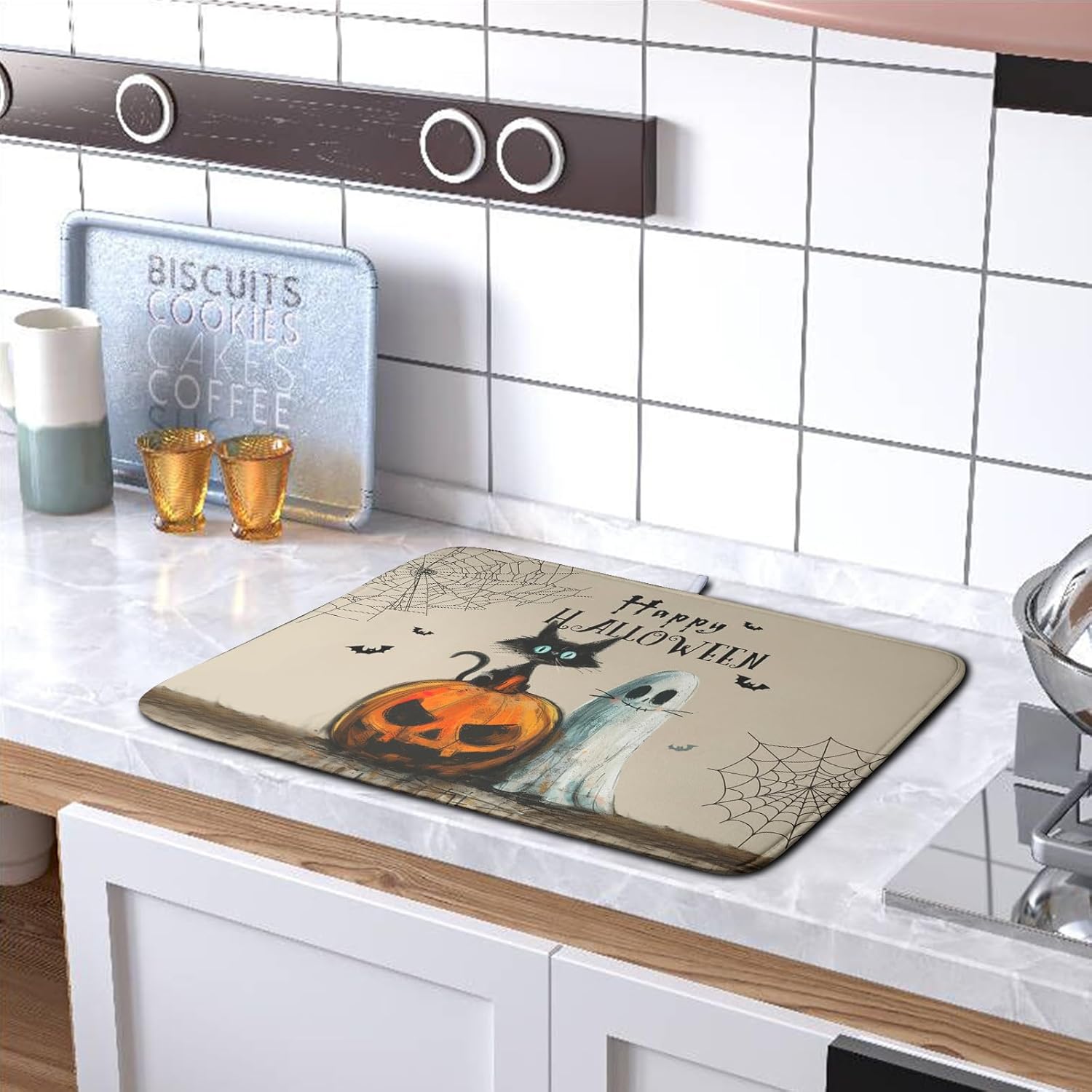 - 【Protect Countertop】The halloween dish drying pad keep the countertop dry, protects your counters from scratches and scuffs. Fits perfectly under the dish drying rack / drainer. It also protects under small appliances such as a mixer, blender, or coffee maker.