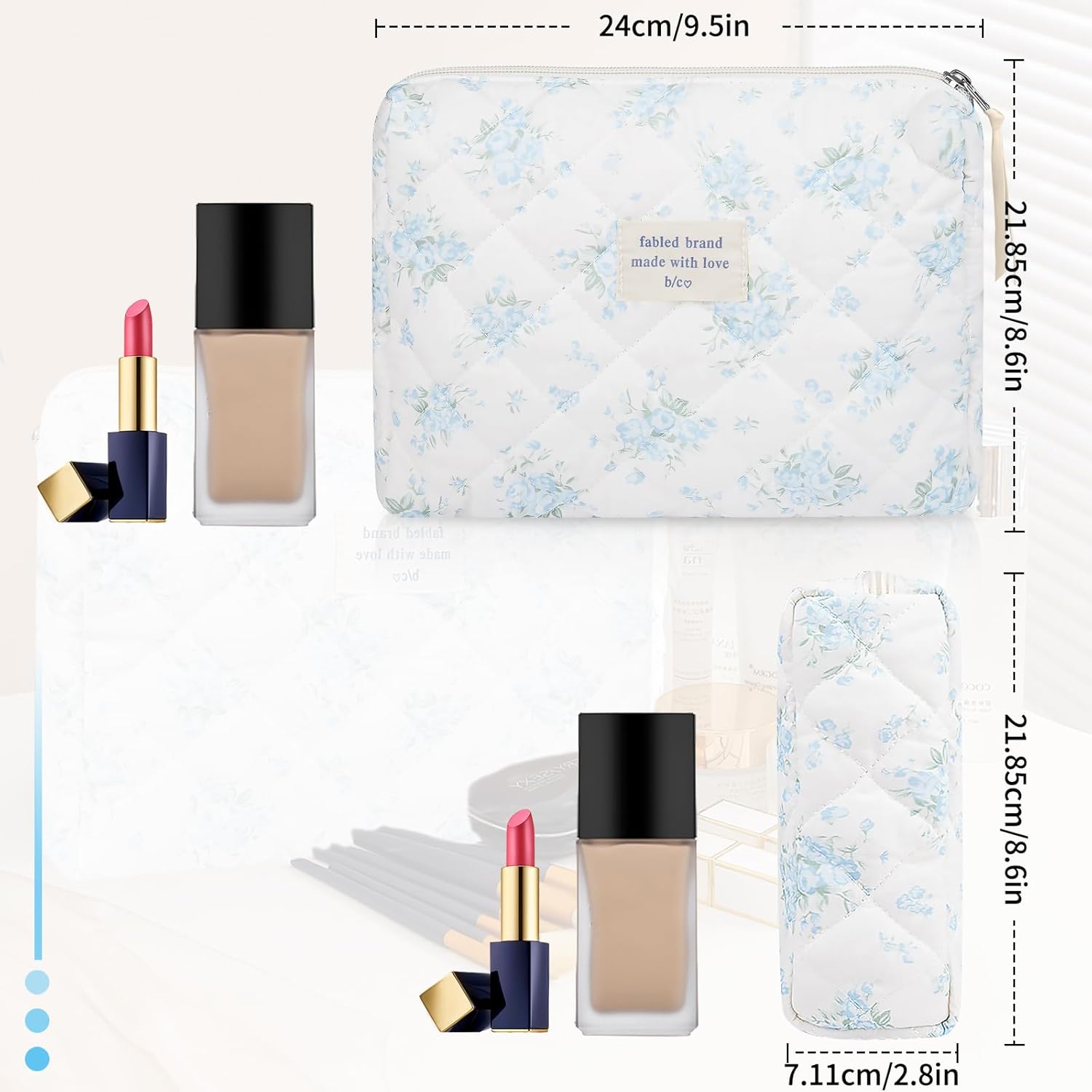 Floral Makeup Bag, Large Cosmetic Bag for Women Girls, Cute Cotton Makeup Pouch, Quilted Makeup Bags, Flower Travel Toiletry Organizer Bag(Blue Rose)