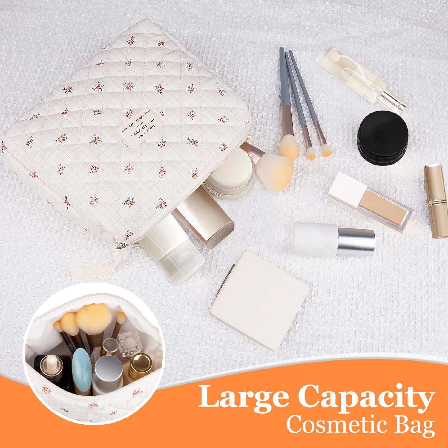 - ✅High-Quality Material: This travel cosmetic bag is made of cotton material, which is easy to clean, has been well- stitched and reinforced at all stress points. The double zipper is made of high-quality gold-plated alloy, which can make the makeup bag easier to pull and align neatly.