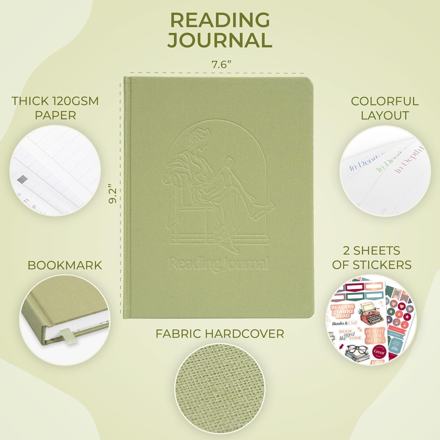 - STICKERS, COLORFUL PAGES & THICK PAPER – This book journal reading log measures 7.6 by 9.2 inches and has a fabric hardcover, colorful layouts, thick 120gsm paper, lay-flat binding, a ribbon bookmark, and 2 sheets of stickers.