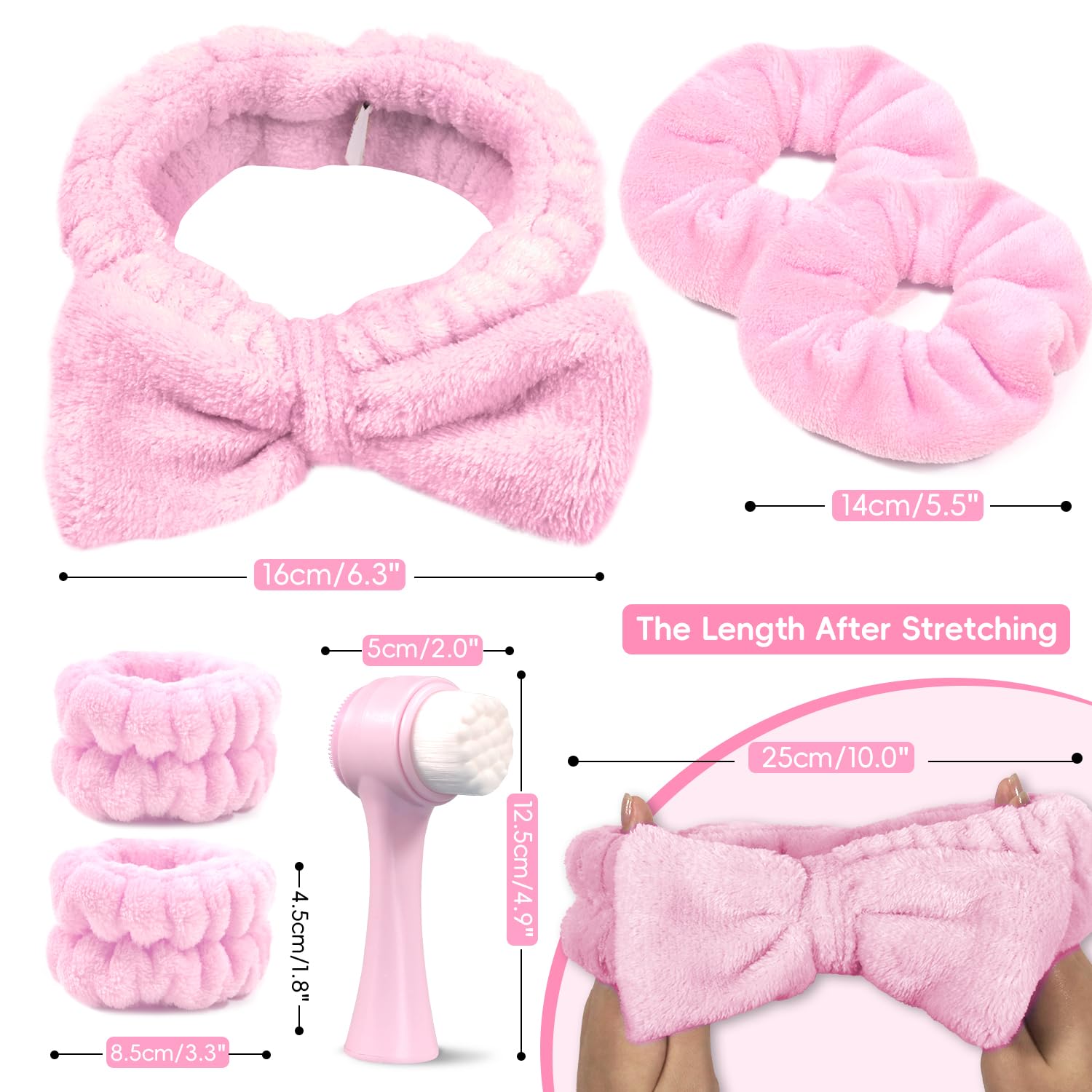 Spa Headband for Washing Face, Skincare headband and wristband set, Facial Cleansing Brush, 2-in-1 Skin Care face Brush, Come with a Hair Scrunchie, For Massaging Makeup Skincare -Pink