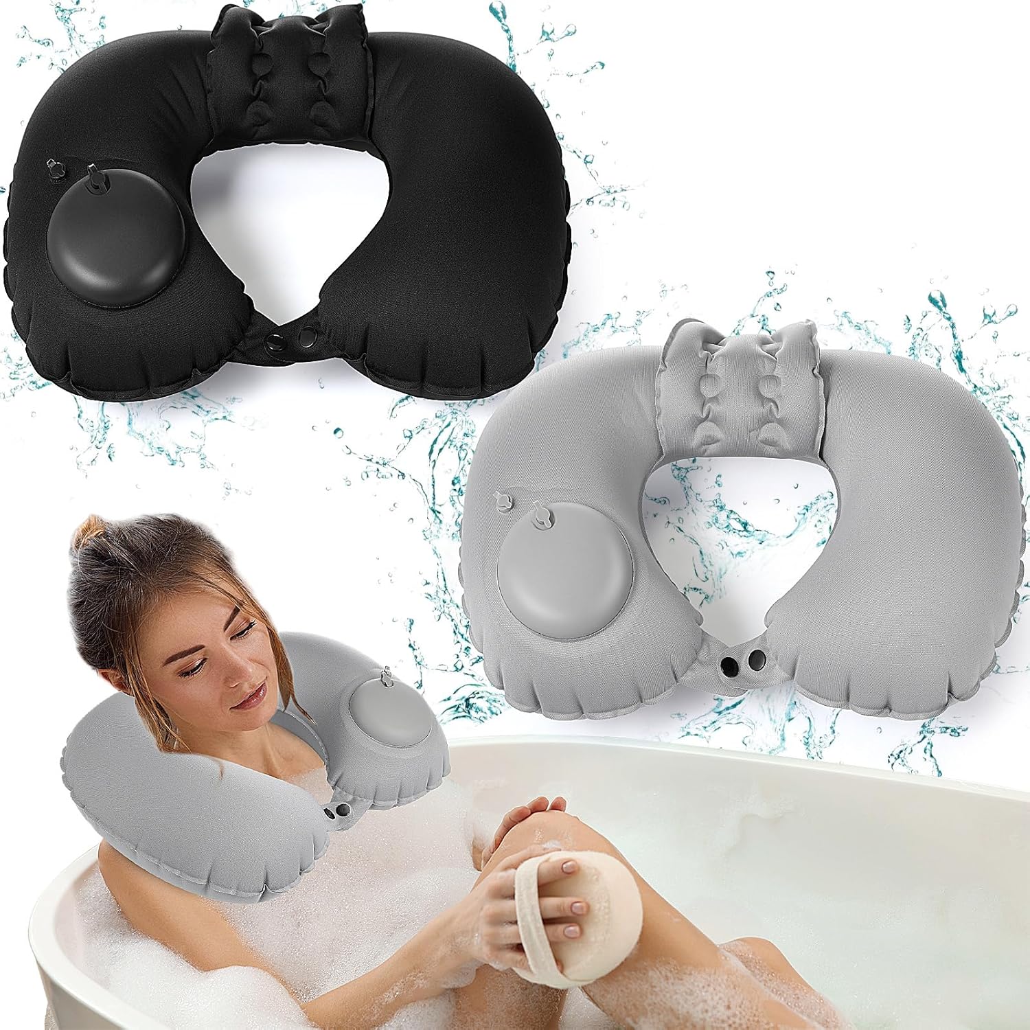 2 Pcs Inflatable Bath Pillows for Tub Bath Head and Neck U Shaped Blow up Full Body Travel Pillow with Adjustable Button Grey and Black Bath Tub Pillows for Airplanes Shower Spa