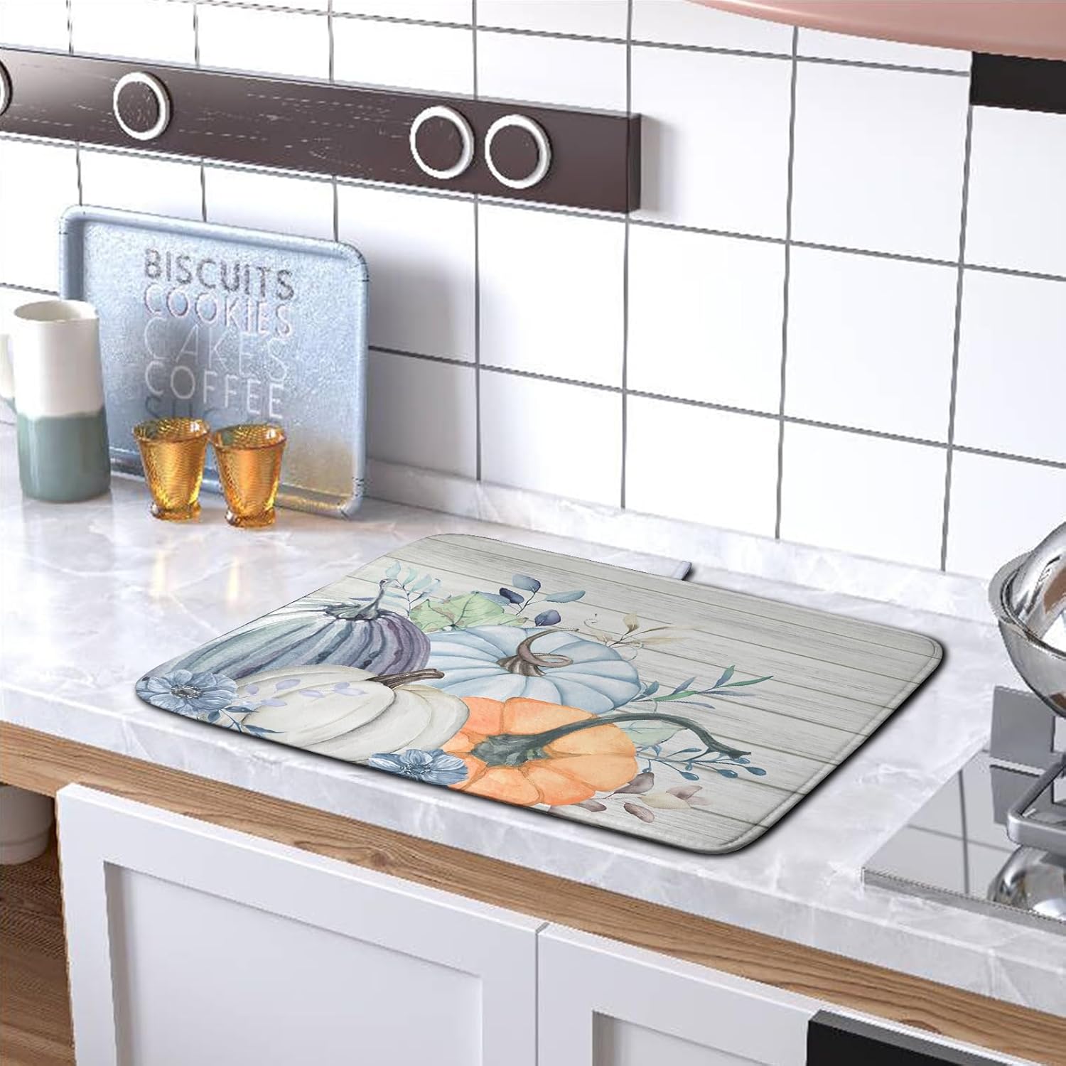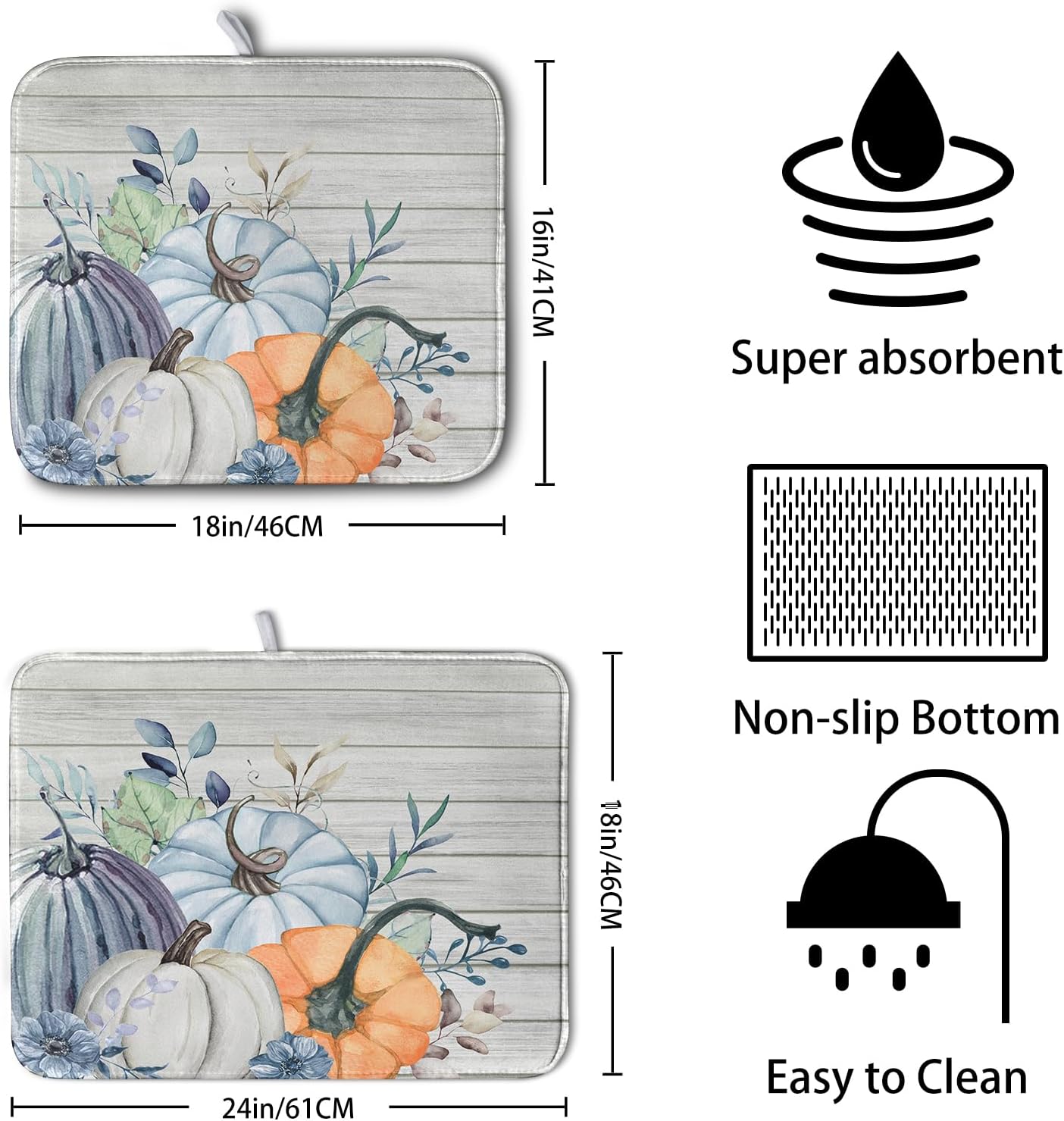 - 【Ultra Absorbency】The surface of the fall blue pumpkin dish drying mat is made of absorbent microfiber and the middle is made of composite sponge, absorbs 4X its weight in water, keep your counter dry. Absorbent, Colorful, Reversible, do not fade.