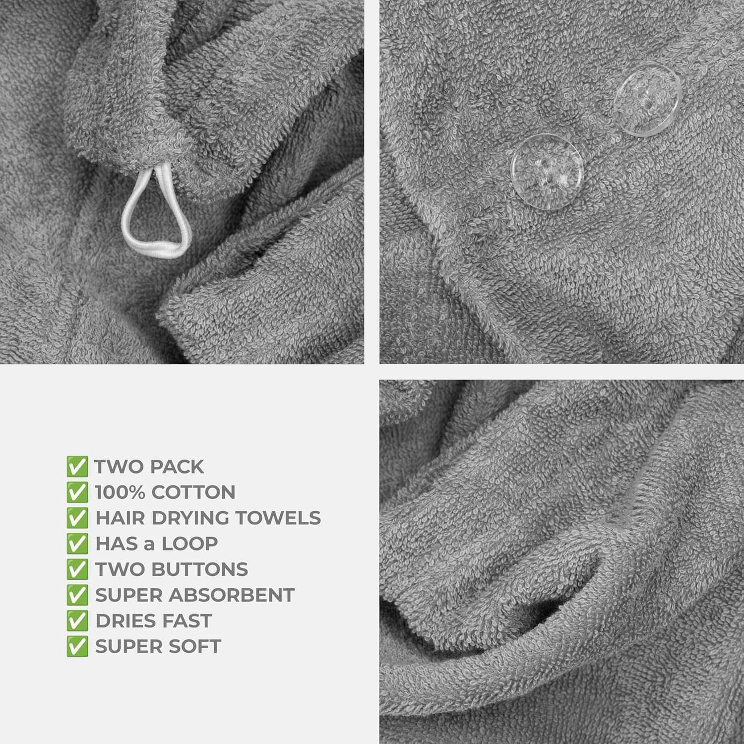 American Soft Linen 100% Cotton Hair Towels for Women, Head Towel Cap, Cotton Hair Turban Towel Wrap for Long Curly Anti Frizz Hair, Soft and Absorbent Cotton Hair Towels 2 Pack, Dark Gray