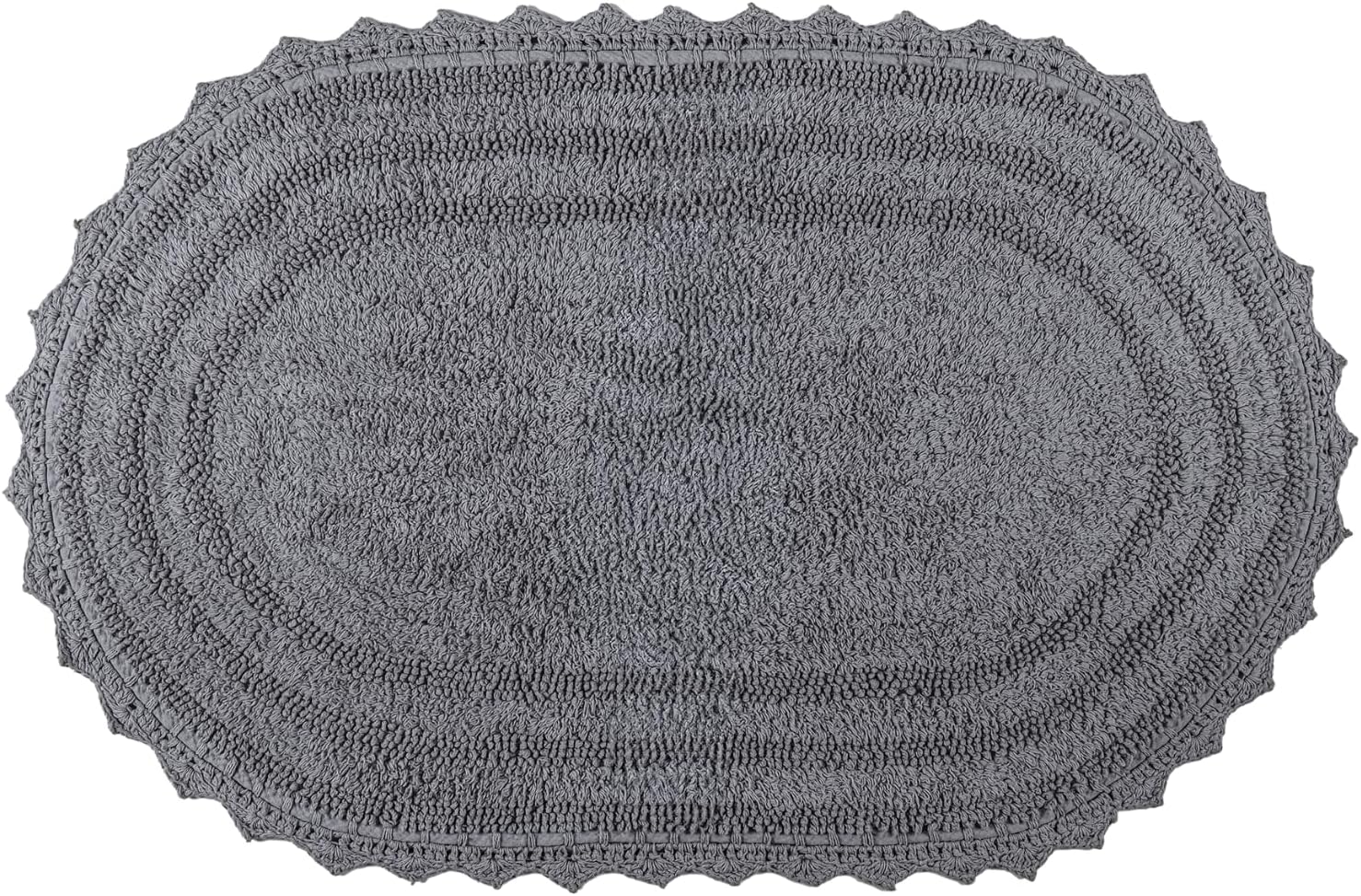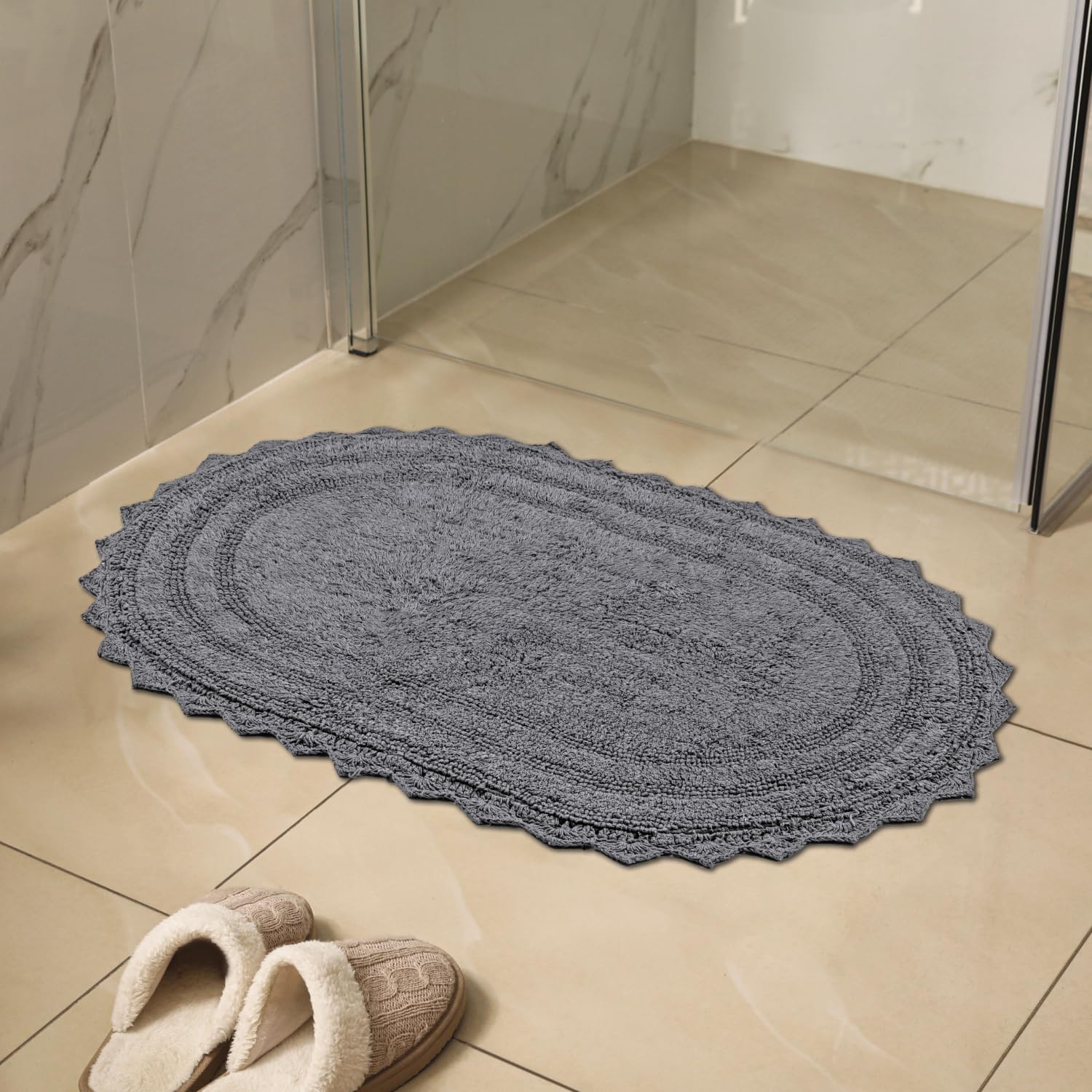 RAJRANG Titanium Grey Oval Cotton Bath Rug 34x21 Inches | Reversible Soft Absorbent Bathroom Mat with Crochet Border | Boho Handwoven Rug for Spa, Kitchen, or Vanity