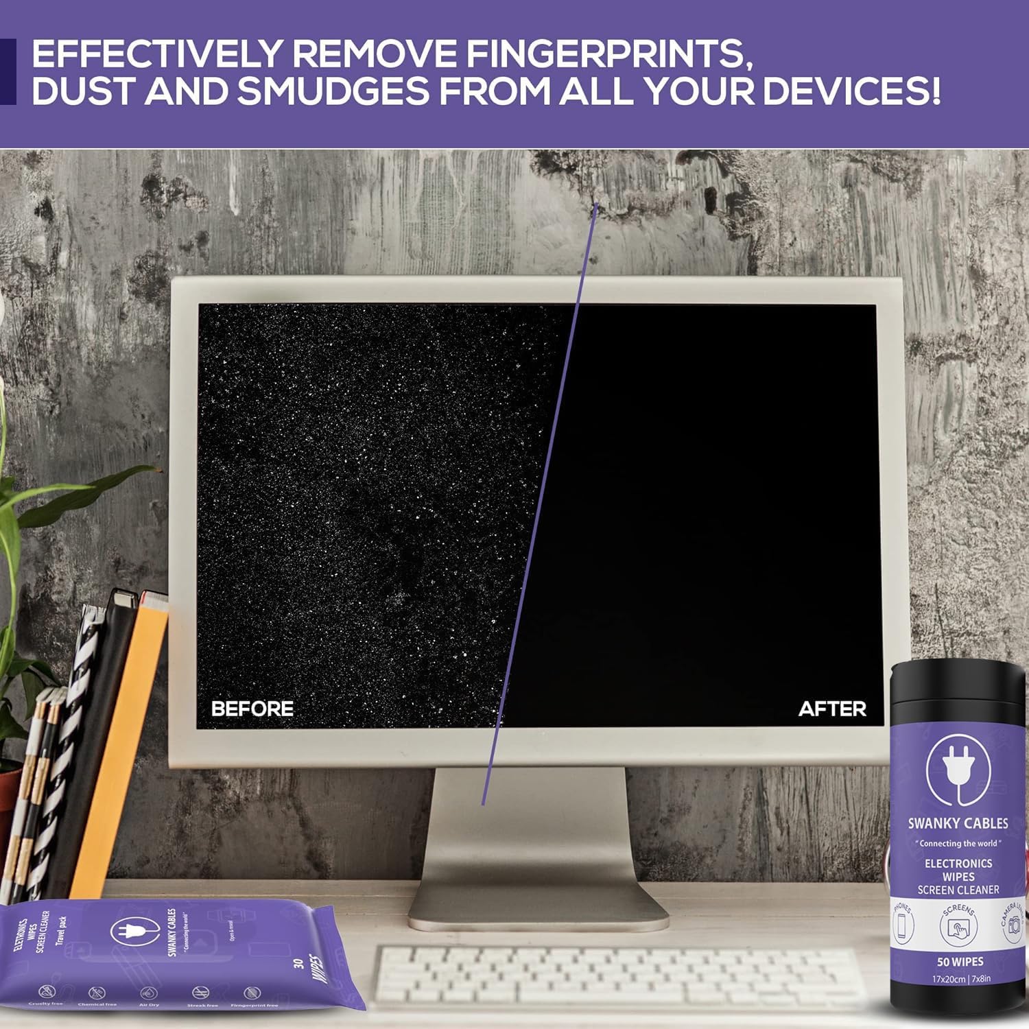 - VERSATILE SCREEN CLEANER - Swanky Cables Screen Cleaner Wipes offer a comprehensive cleaning solution for all your electronic devices. Ideal for TVs, laptops, phones, and monitors, these wipes effortlessly remove smudges, and fingerprints, ensuring your screens are clean and clear.