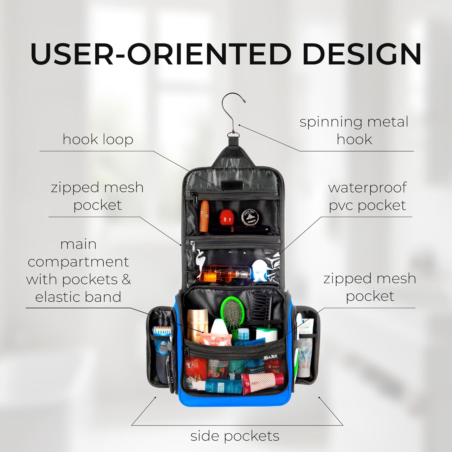 • VERSATILE TRAVEL BAG FOR TOILETRIES: Compact, lightweight and made of premium polyester with no smell,and an easy to clean lining, this large toiletry bag is a keeper! Plus, it will save you the mess of spilled liquids on your clothes in your luggage, thanks to its 100% waterproof inner lining! guaranteed.