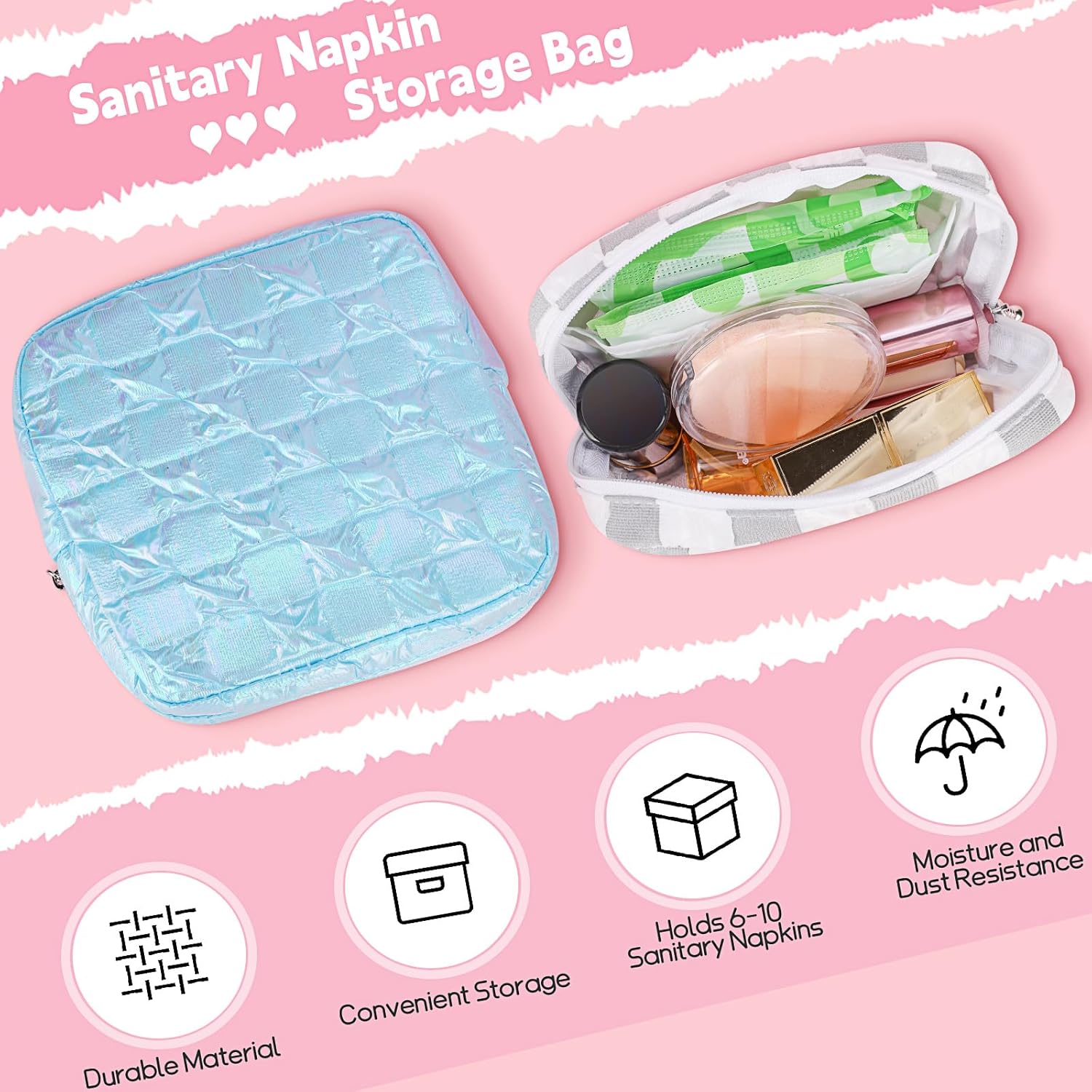 - 💕 MEET YOUR DAY'S NEEDS - Having a compact size: 5.1 x 5.1 x 1.6 inches, the pad storage bag can hold 6-10 pieces of normal size sanitary napkins. There is an inner pocket inside the period bag, which is easy to store small size tampons or panty liners and keep them clean always. It's portable to put the sanitary napkin storage bag in your backpack/ purse/ handbag and so on.