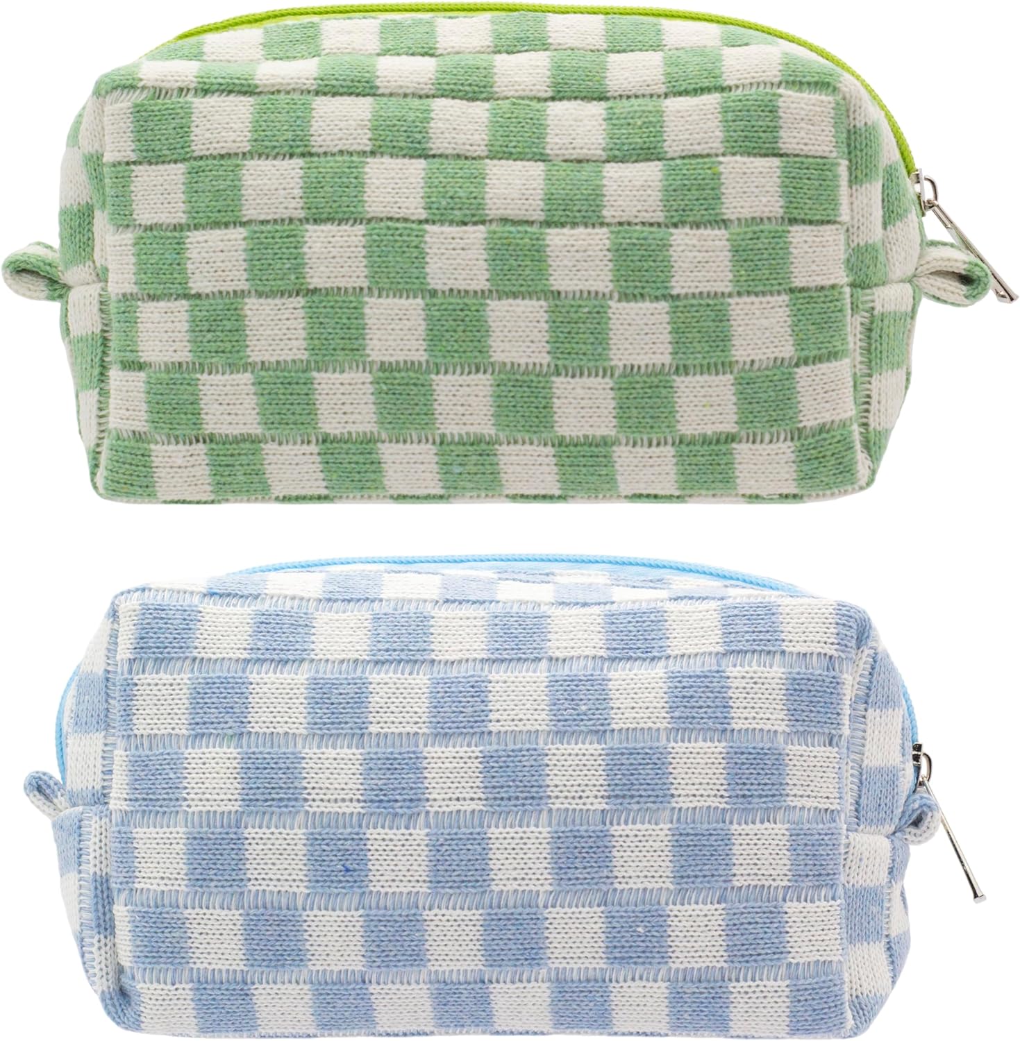 PAZIMIIK Checkered Makeup Bag for Purse Portable Zipper Make Up Pouch Small Cosmetic Case for Travel Accessories (2PCS Blue Light Green)