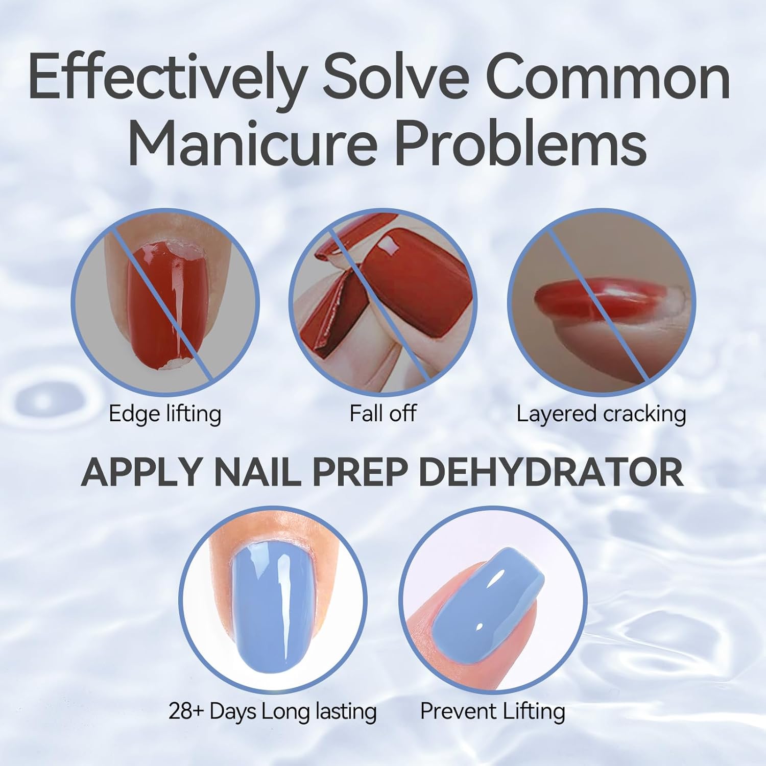 - NO LIFTING: NAIL DEHYDRATOR is especially to get rid of the oil and dry up the whole cuticle in the nail bed area. When used together these high-quality products will prevent lifting and provide nails for lasting more than 30 days.
