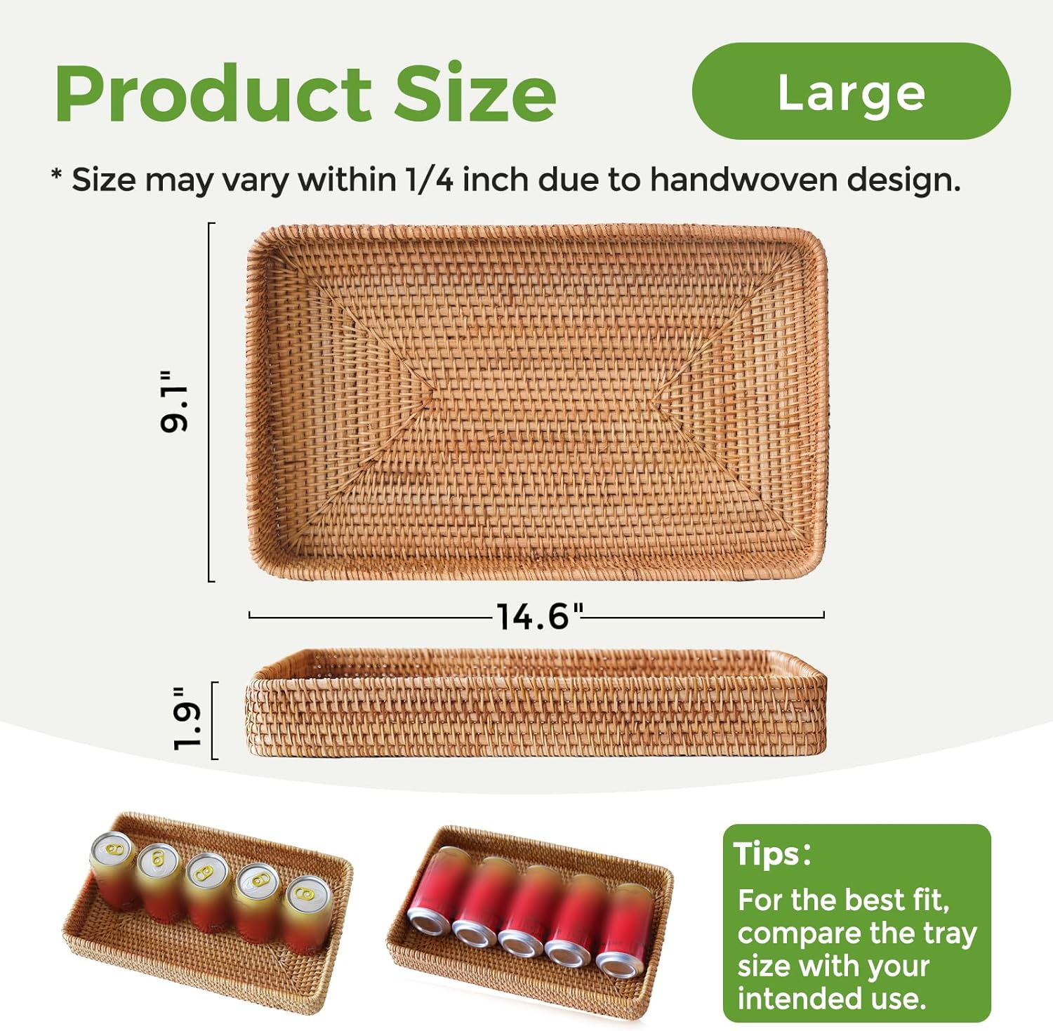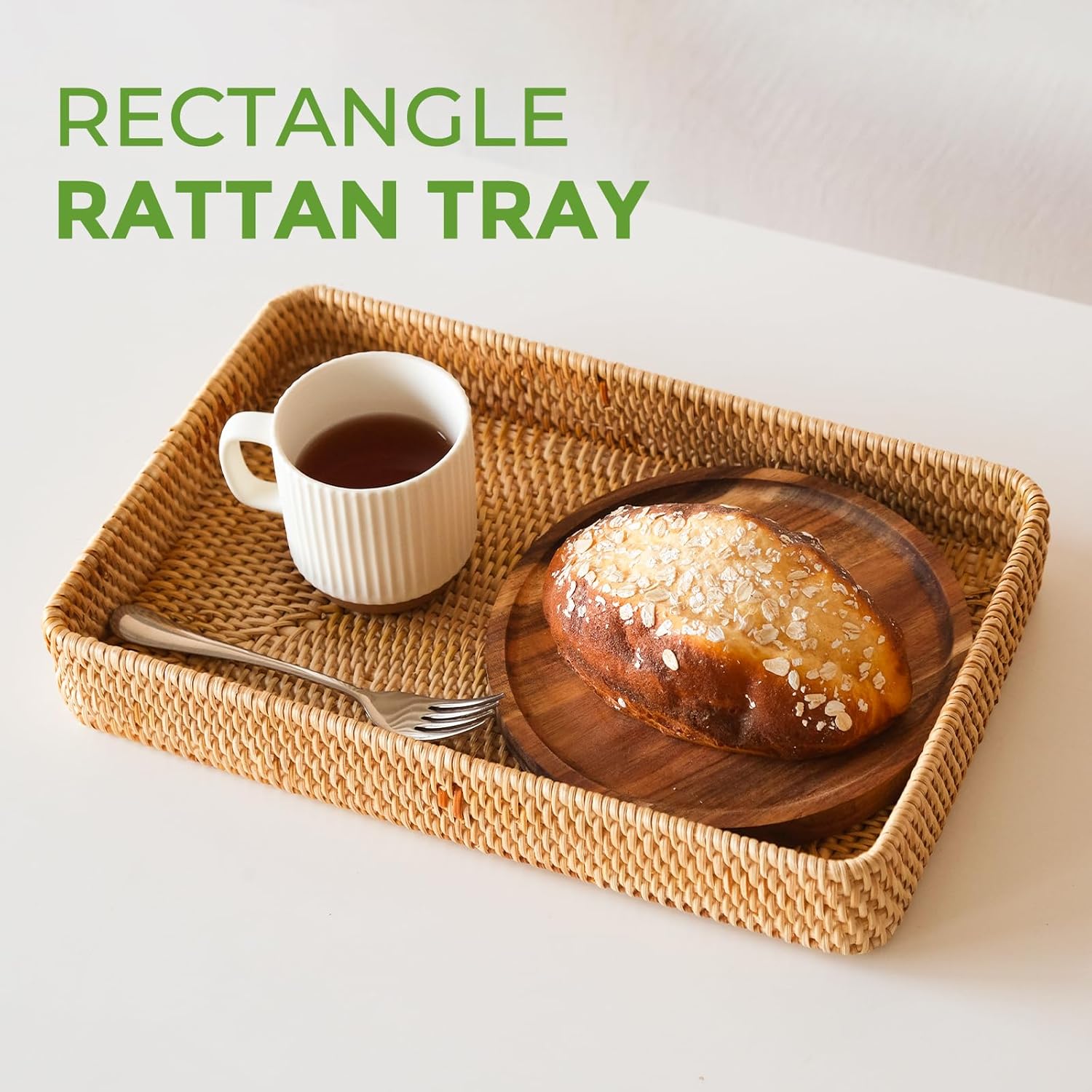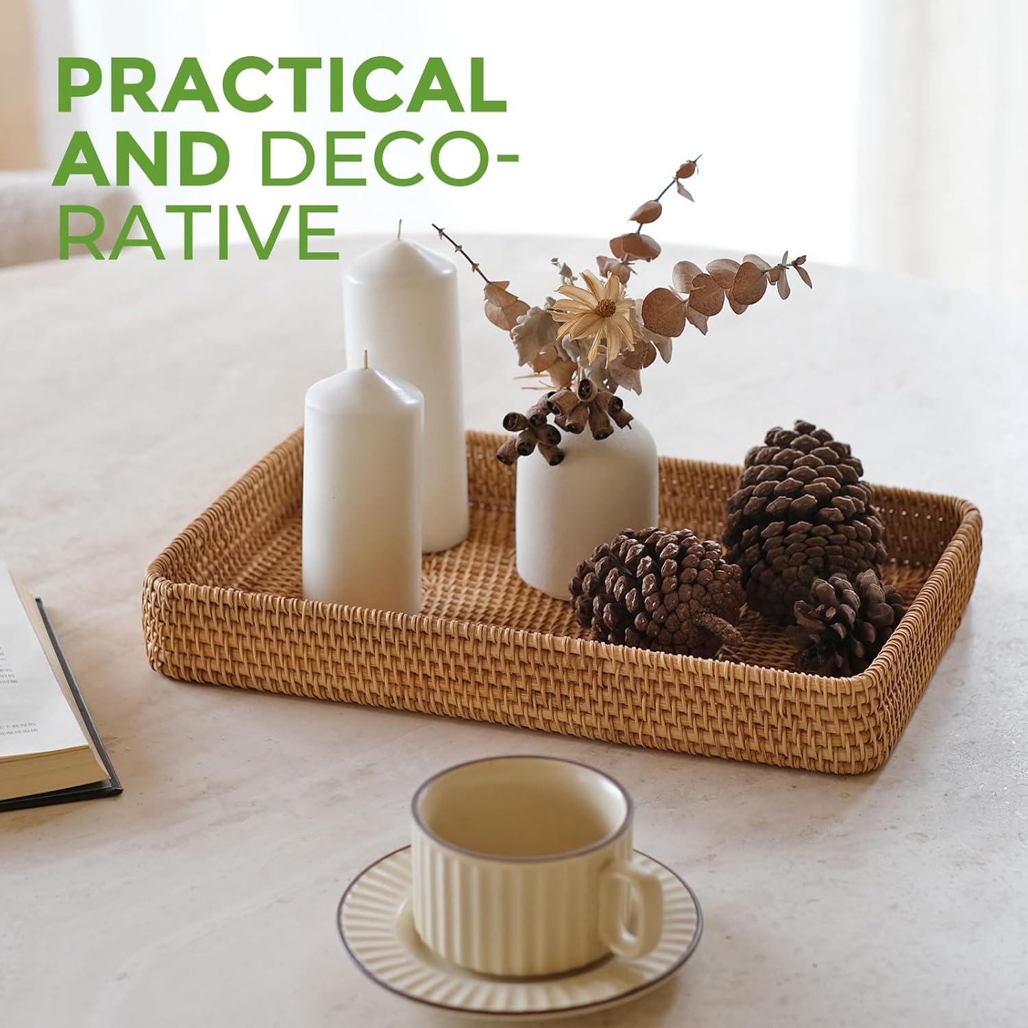 - Versatile Use rattan basket: The generous size of the decorative tray makes it ideal for organizing and storing items. It can be used as a decorative serving tray, a kitchen counter tray, or for displaying and organizing various household items.