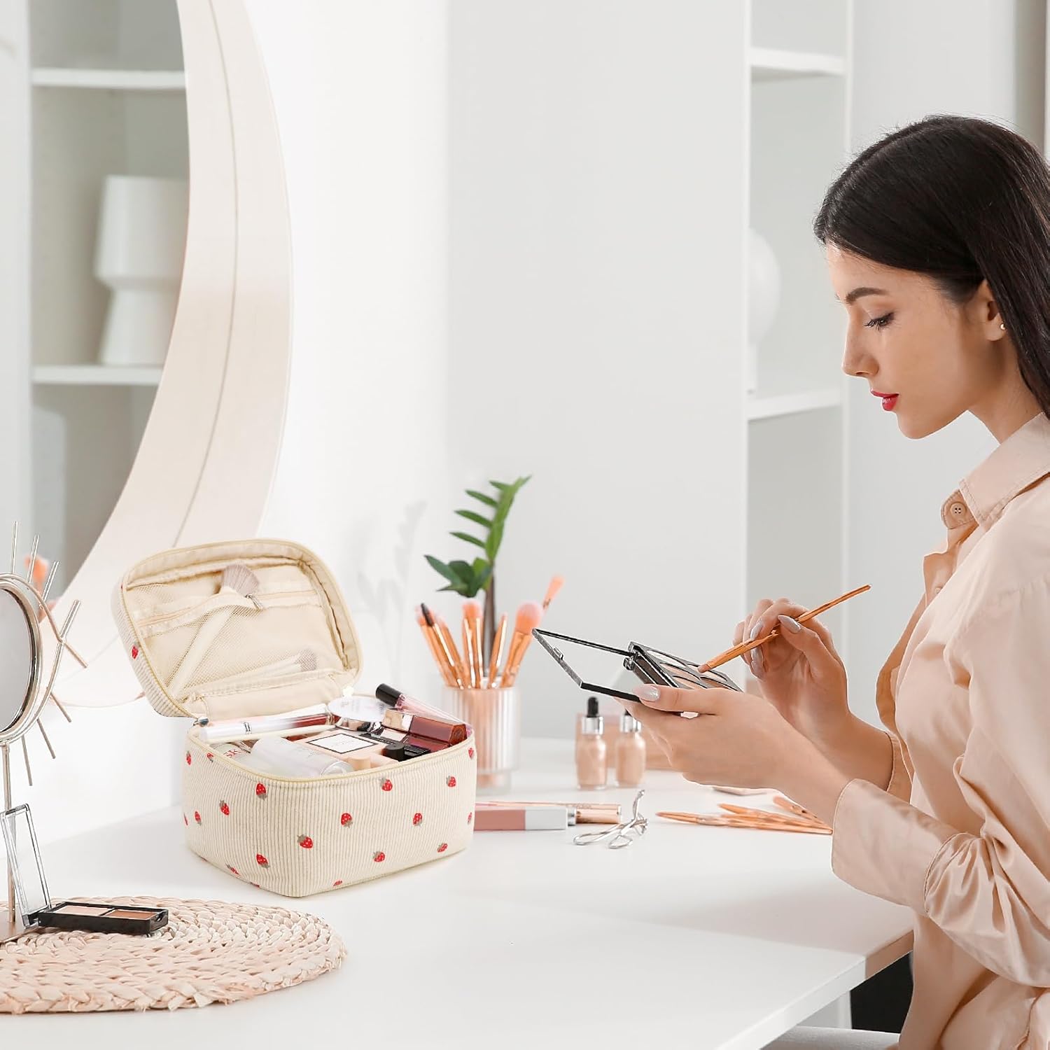 Prite Corduroy Large Travel Quilted Makeup Bag for Women Floral Cotton Cosmetic Bag Coquette Aesthetic Floral Toiletry Organizer Bag(Strawberry)