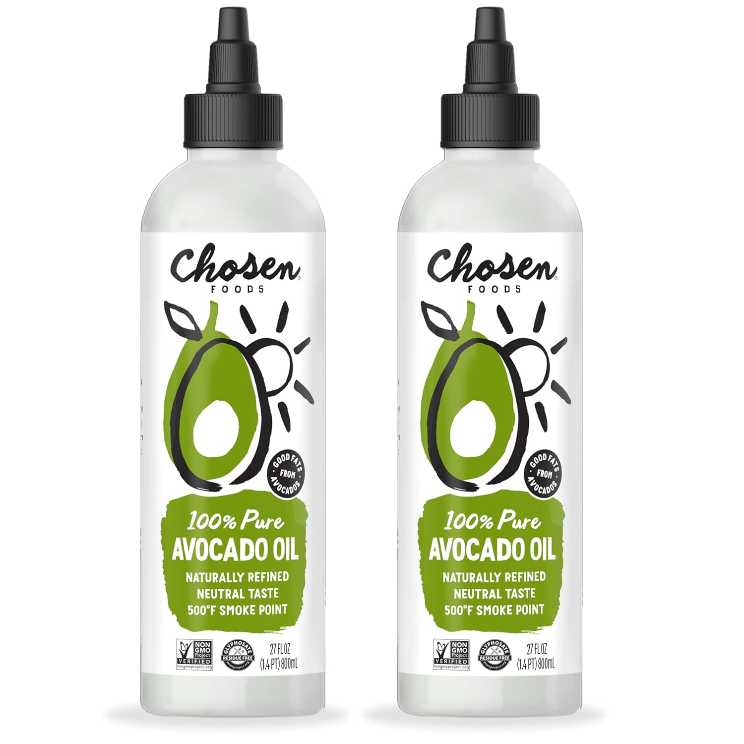 Chosen Foods 100% Pure Avocado Oil Squeeze Bottle 27oz 2-pack - For Drizzling, Sautéing, Roasting, Searing, & Baking-High Smoke Point Cooking Oil - Kosher, Keto Friendly - With Recipe eBook