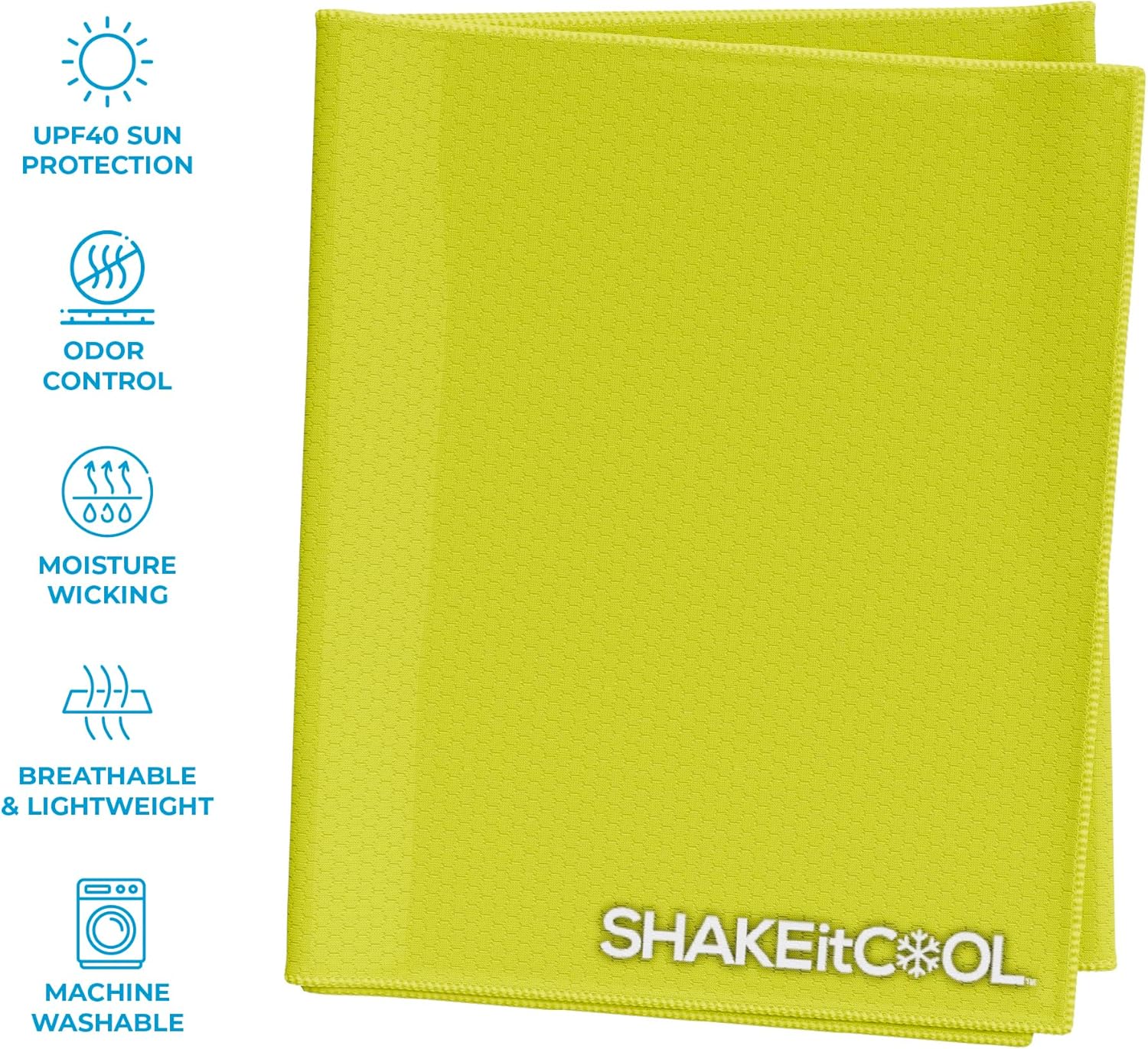 SHAKEitCOOL Extended Size Cooling Towel – Be Cool in Style - Heat Relief, Soft, Lightweight, Sun Protection, Easy Clean - Perfect for Biking, Hiking, Running, Yoga, Golf, Gardening - Safety Yellow M