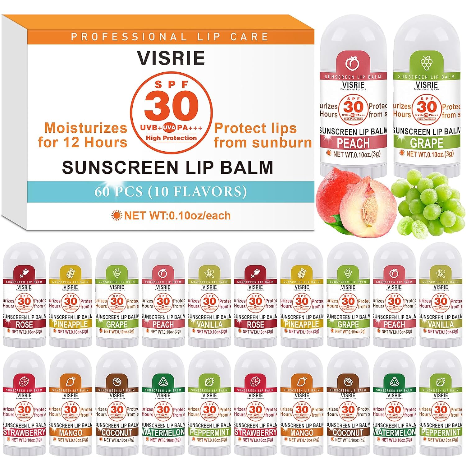 - 【FLAVOR LIP BALM】Our spf chapstick bulk includes 10 different flavors-Rose, Mint, Mango, Peach, Coconut, Watermelon, Strawberry, Vanilla, Pineapple, Grape. The flavors are subtle and work for anyone