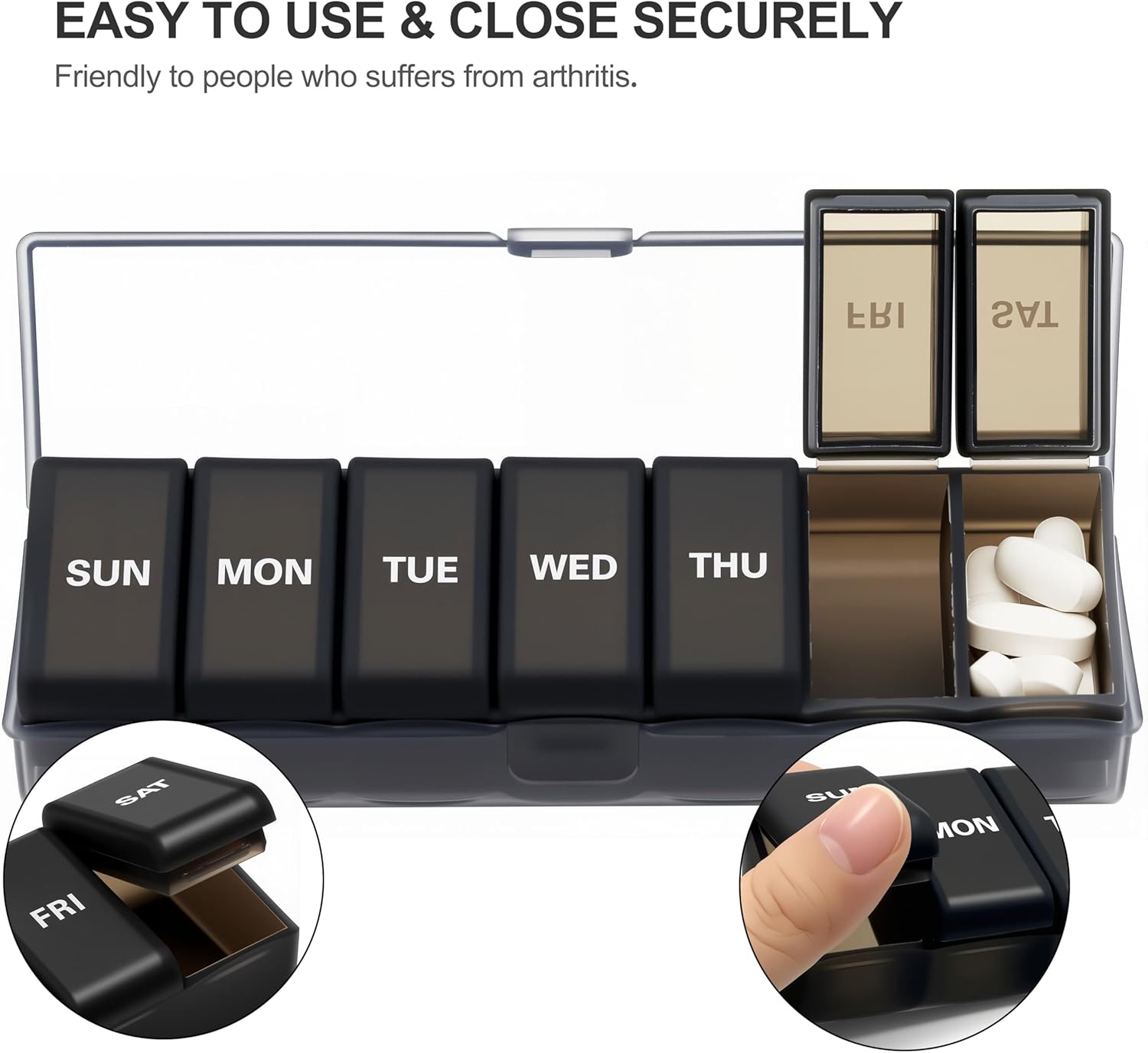 Silicone Weekly Pill Organizer 7 Day, Arthritis-Friendly Medicine Box Daily Pill Box, Large Medicine Case with Shell, Compact Travel Pill Container for Pill, Vitamin, & Fish Oil (Black)
