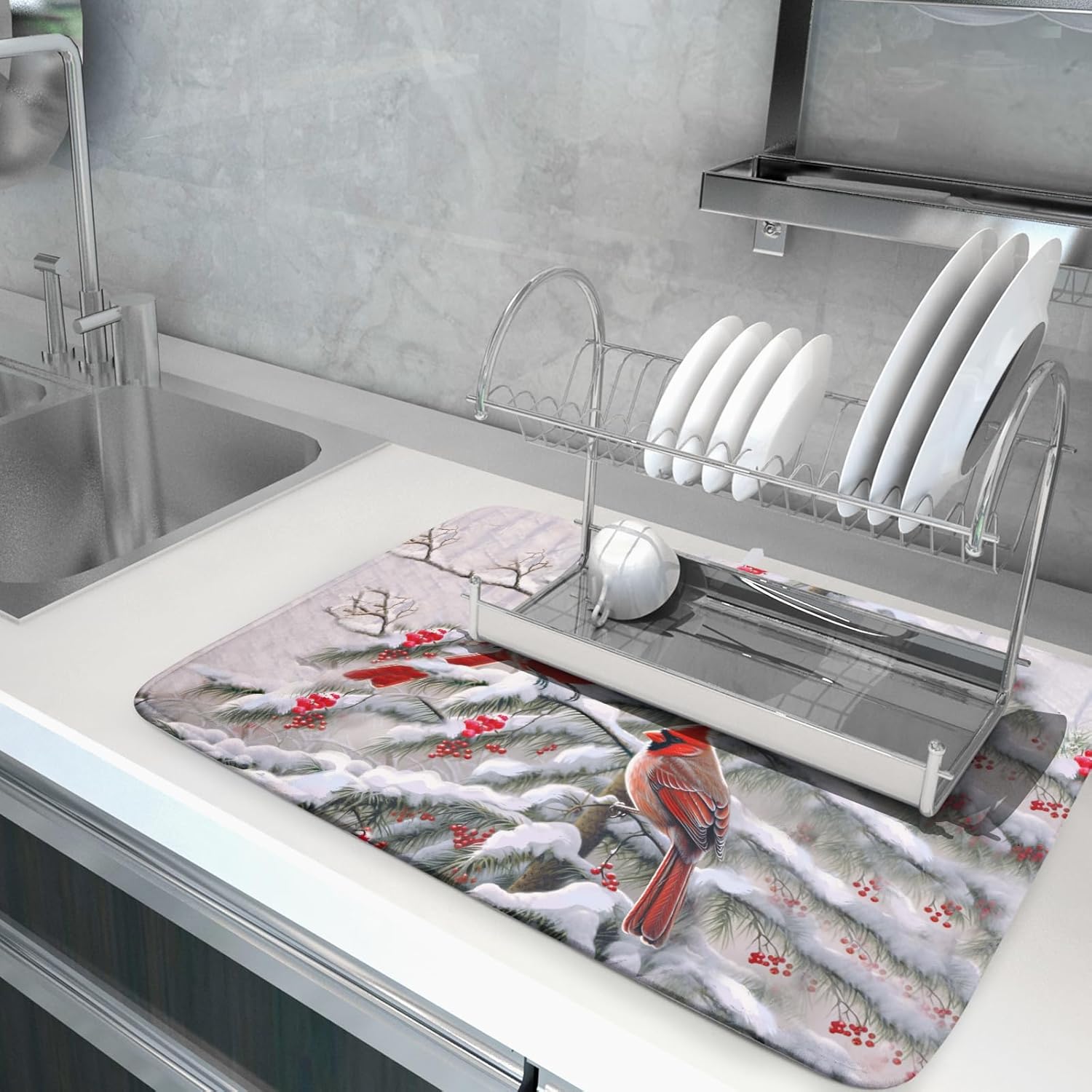 Red Birds Dish Drying Mat Winter Berry Dish Drainer Mats Absorbent Reversible Microfiber Kitchen Countertop Protector Dishes Pad 18x24 inch
