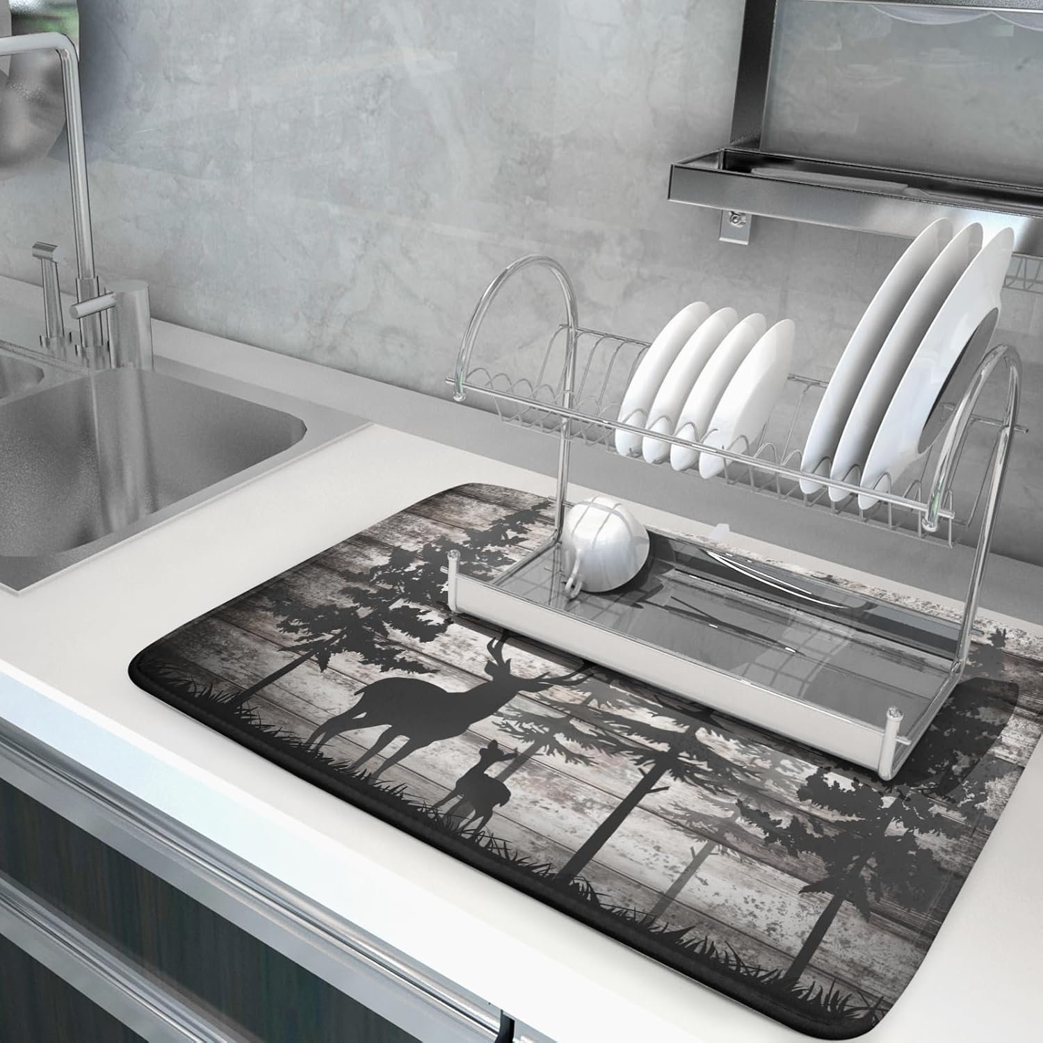 - 【Wide Usage】The dish drying mat designed with woodland hunting pattern, it is beautiful, soft, and durable. Not only a dish drying mat, cup mat, heat resistant mat, you can also use it as a kitchen countertop insulation mat. It is also a good choice to use it as a pet mat, picnic mat.