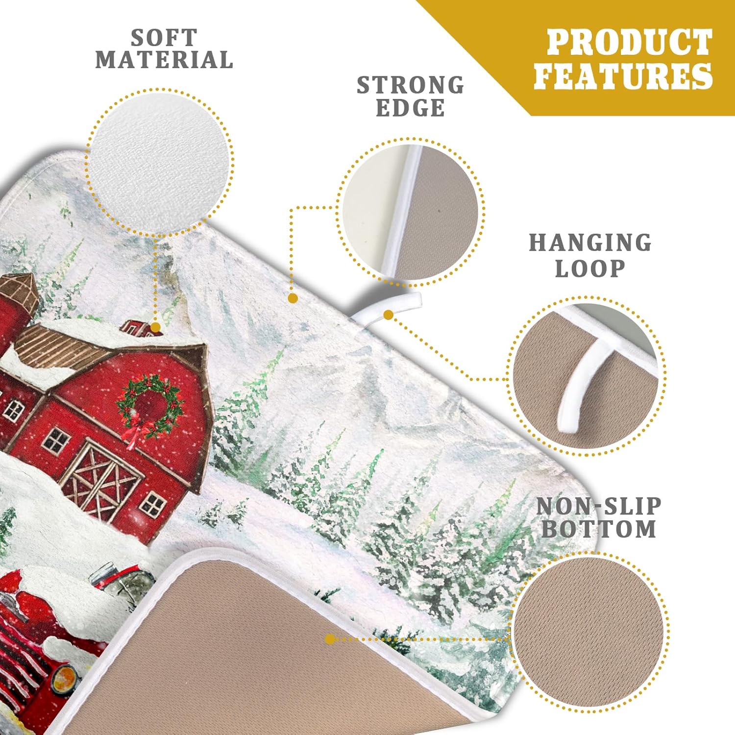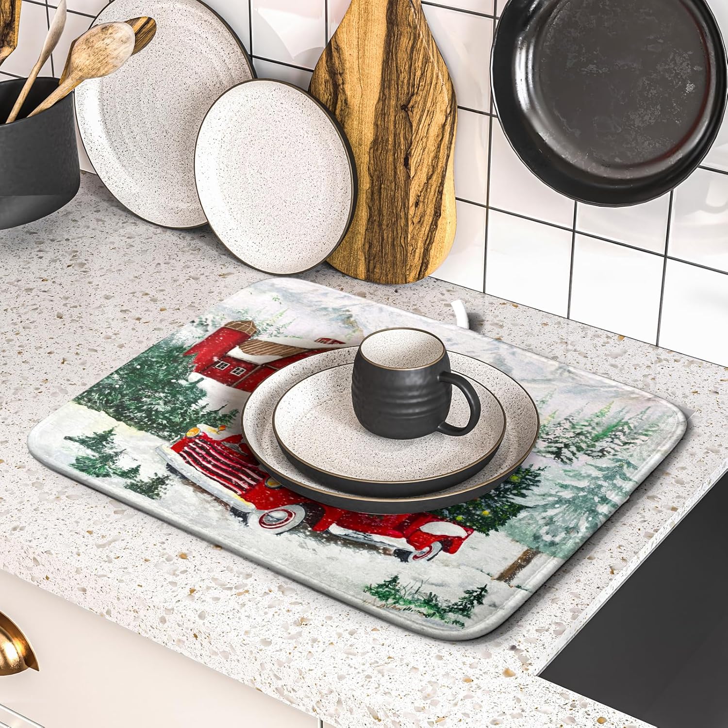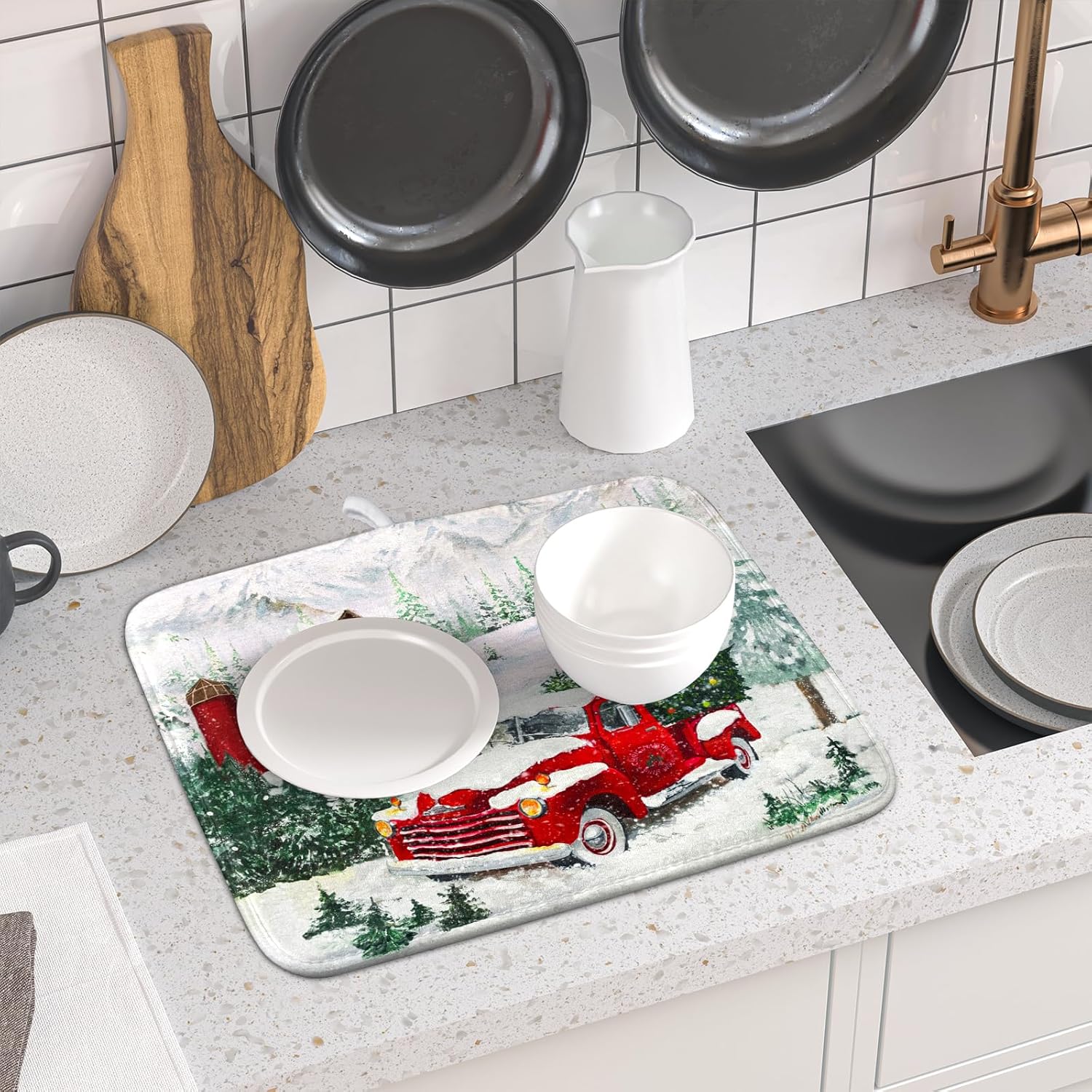 Winter Red Truck Dish Drying Mat Christmas Tree Dishes Pad 16x18 Inch Dish Drainer Rack Mats Absorbent Fast Dry Kitchen Holiday Accessories