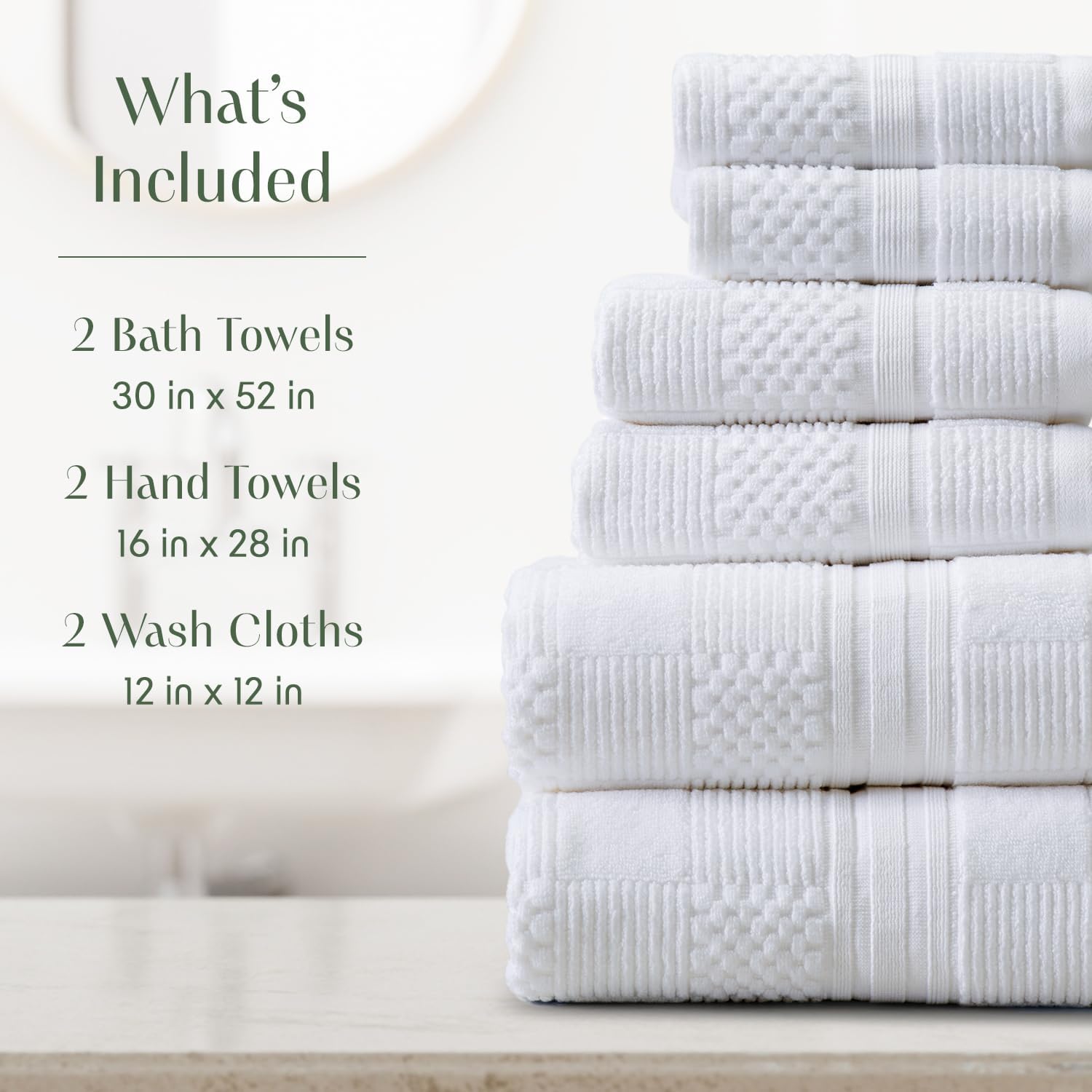 - SET INCLUDES : 6-Piece set of 2 Bath Towels 30" x 52", 2 Hand Towels 16" x 28", 2 Wash Cloths 12" x 12"