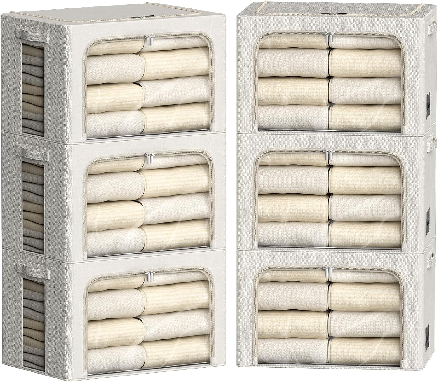 FHSQX 6 Pack Clothes Storage Bins with Metal Frame Foldable Storage Bins for Clothes Linen Fabric Storage Box with Clear Window (Lvory White, 15.7x11.8x7.8inch(22L))