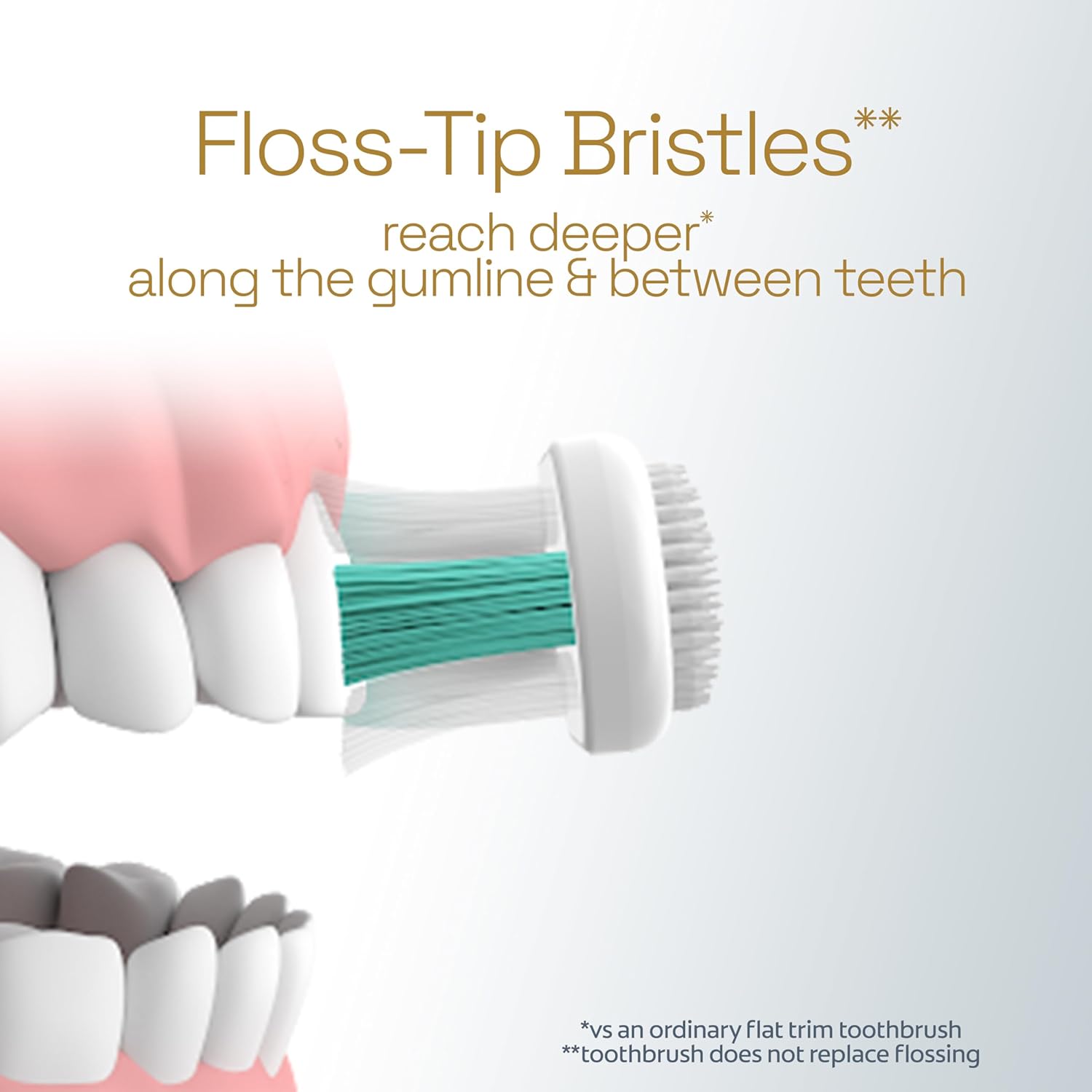 - This manual toothbrush features medium tapered Floss-Tip (1) bristles that reach deeper (2) along the gumline and between teeth to remove bacteria