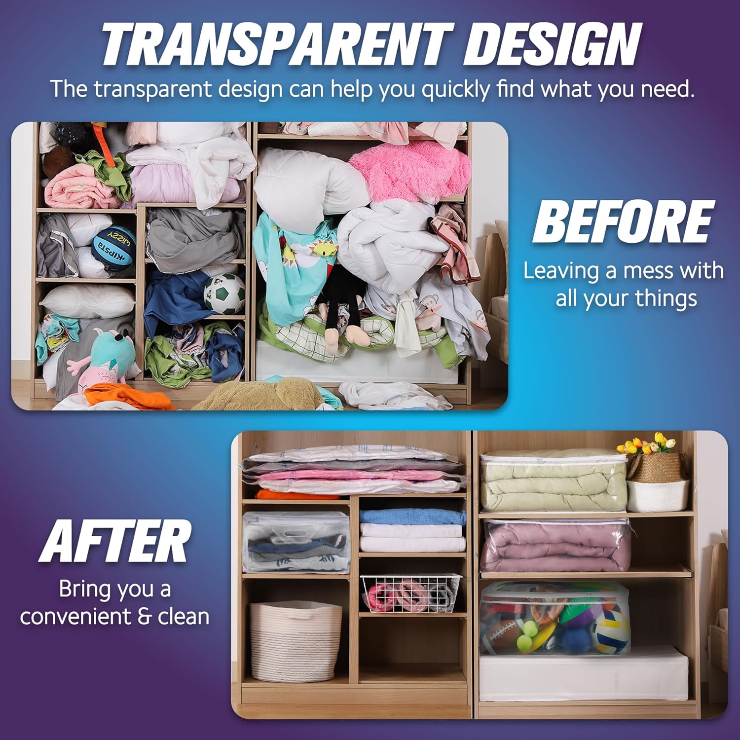 - Transparent and Airy Design: The semi-transparent plastic of these storage bags provides a clear view of the contents, enabling you to easily spot the clothes you've stored away. The breathable mesh fabric along the zipper ensures proper air circulation, contributing to the freshness, thus keeping your stored items clean and well-ventilated for an extended period.