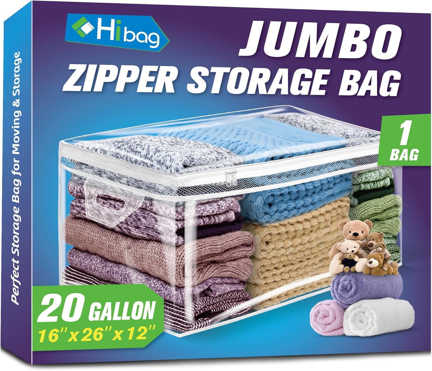 HIBAG 20 Gallon Large Storage Bag for Clothes, Zipper Clothing Storage Bag, Clear Organizer with Reinforced Handles, for Comforters Blankets Pillows Bedding (1 Pack)
