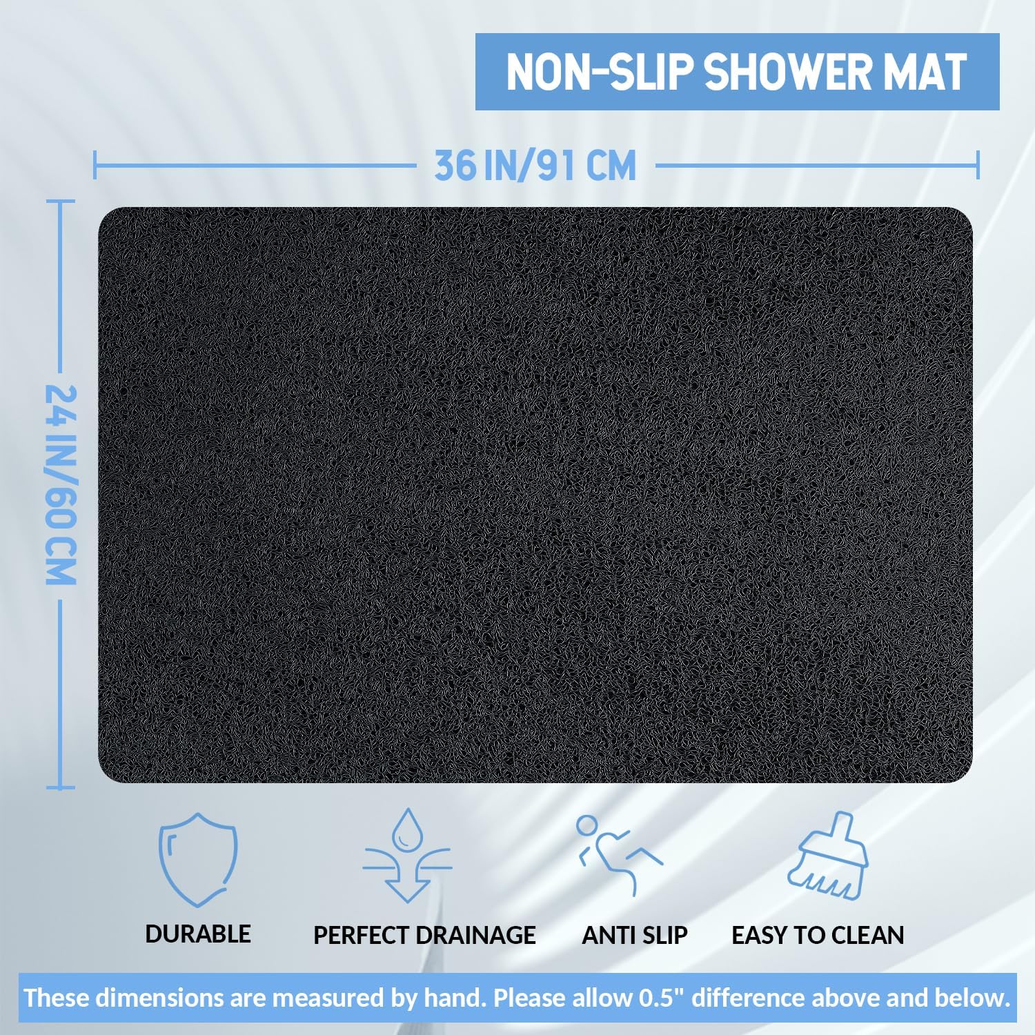 - 【Quick Drain & Perfect Size】The bath mat has hundreds of small drain holes to allow water to circulate. Water flows quickly through the bath mat without getting stuck. You can also cut the mat to any size and shape you need, so this mat will fit perfectly in any corner of your home.