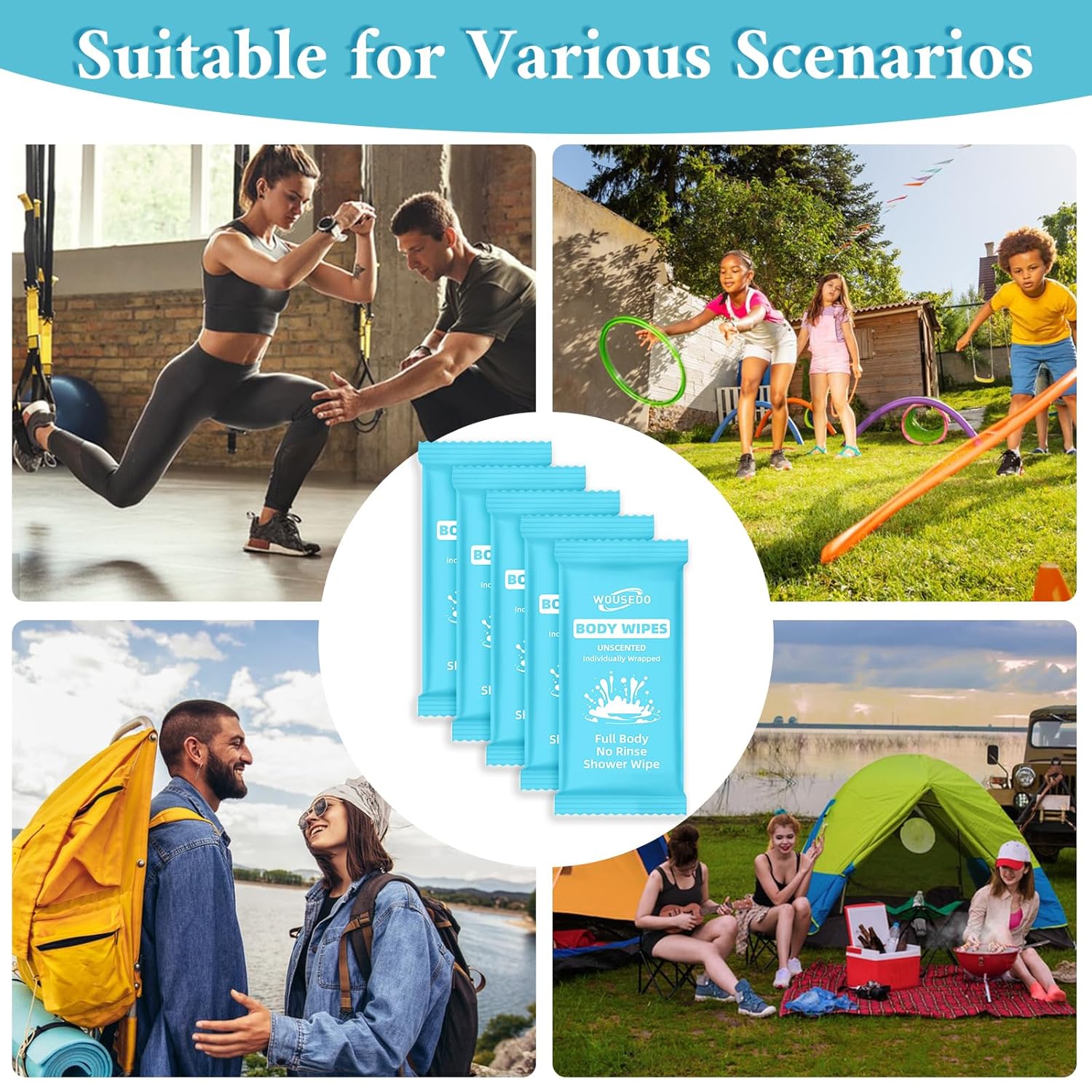 - Wide Applications: Our body wipes are suitable for all age groups and can be applied in a variety of scenarios. Whether you are traveling, camping, exercising, or just need a quick refreshment during the day, our shower wipes are always handy. They are a convenient and efficient cleaning solution that fits your active lifestyle, suitable for home, office, gym and other outdoor settings.