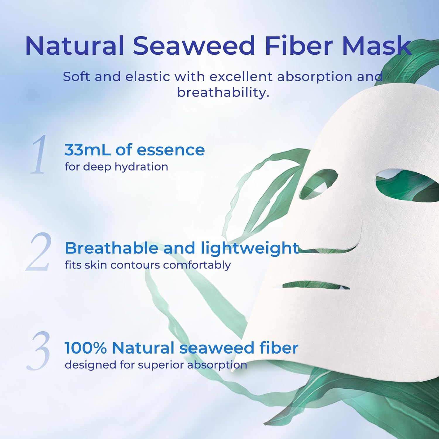 - Seaweed Fiber Mask Fabric: Soft and elastic, the mask fits instantly upon application. Invisible and breathable, it feels light and comfortable. With 33mL of essence, indulge in 15 minutes of moisturizing nourishment.