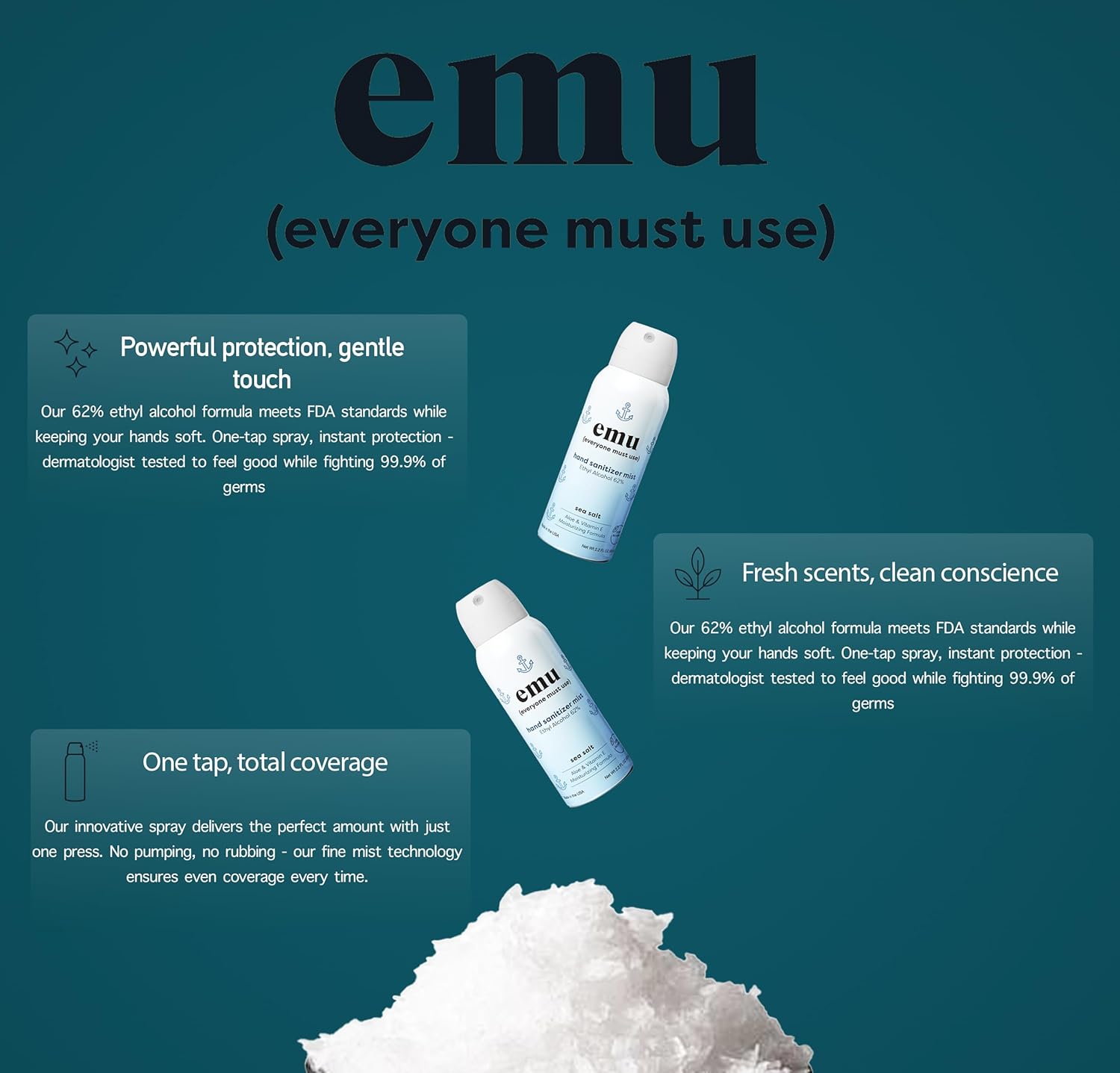 EMU (EVERYONE MUST USE) Hand Sanitizer pocket spray, Travel size 2.2oz. Cleanses Your Hands, Hydrating. Hand soap bulk. 24-hour disinfectant sanitizing. Made in USA (Sea Salt_3)
