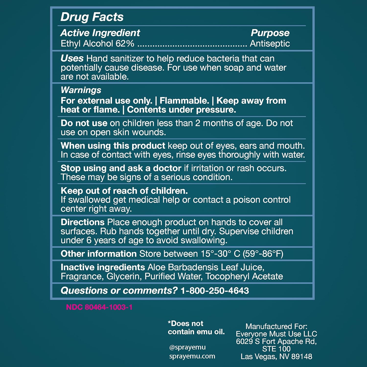 - 1. Superior Efficacy: EMU Hand Sanitizer Spray eliminates 99.9% of germs and bacteria, ensuring your hands are always clean. It provides reliable protection. TSA Approved / Non-Aerosol / 100% Recyclable