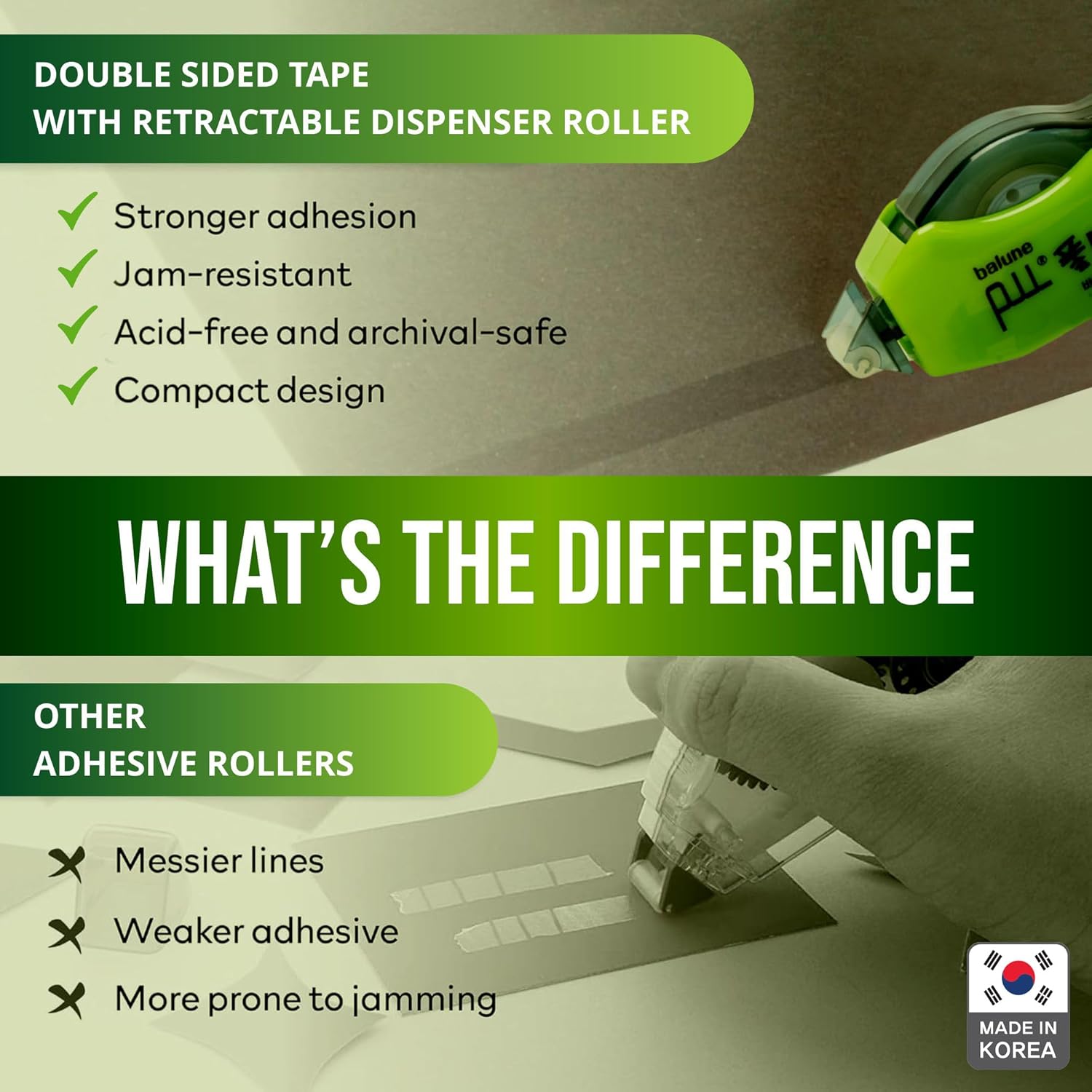 - VERSATILE AND MULTI-PURPOSE USE: Our double-sided adhesive tape is ideal for various crafts, including scrapbooking, gift wrapping, and home projects. Suitable as glue tape roller, glue dots double sided, and double stick tape, it's a must-have for every craft enthusiast. Package includes 2 Runners and 8 Refill Cartridges.