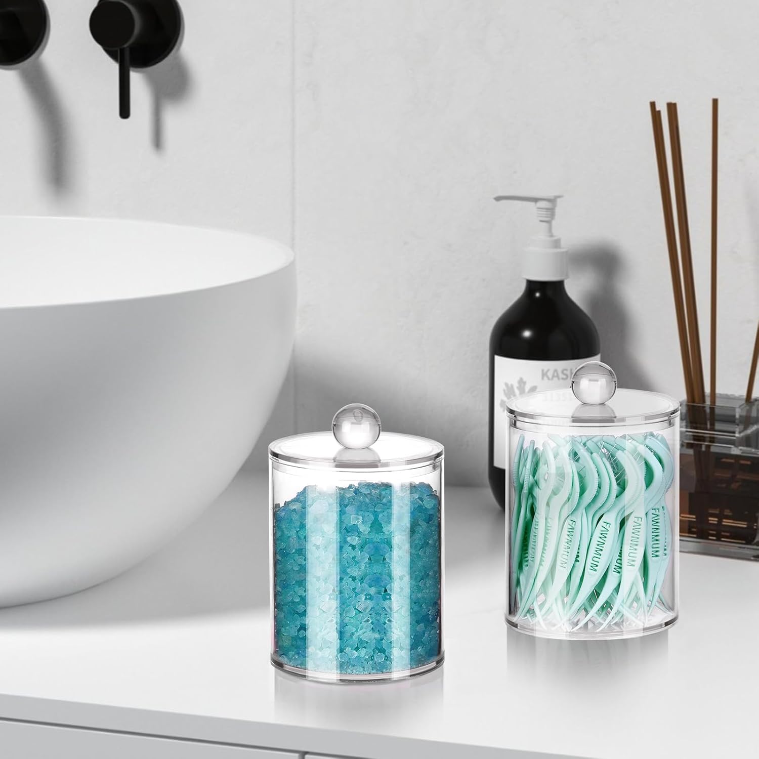 2 Pack Qtip Holder,Canister Apothecary Jar Set, Bathroom Jars with Lids Set for Cotton Swabs, Balls, Pads, Floss Picks,10oz-12oz Plastic Canisters Restroom Bedroom Vanity Organizer(Clear)